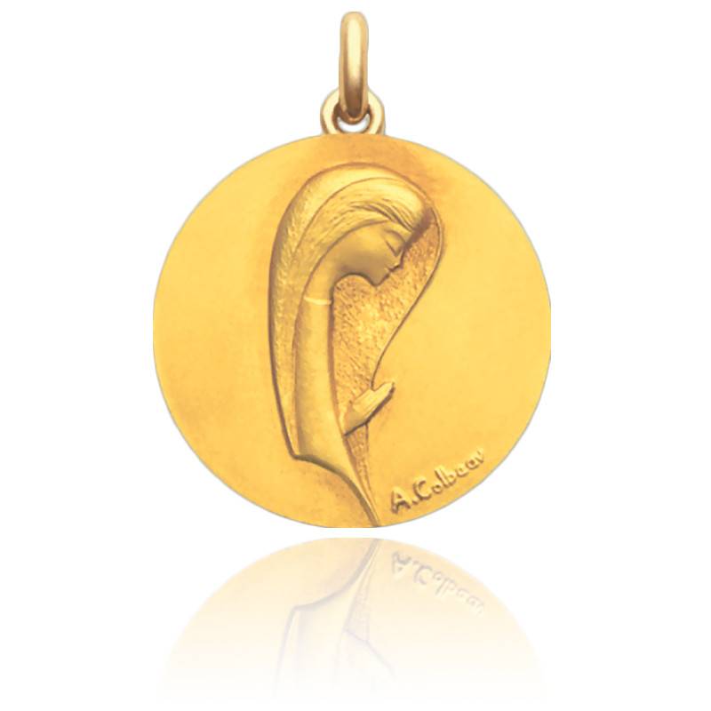 De forme ronde, cette médaille de la maison Becker est conçue en or jaune 750/1000 (18K) et affiche un dessin réalisé par l'artiste Colbeau. Le design stylisé qui orne la face de cette médaille est une Vierge Marie les mains jointes, ce qui en fait un cadeau idéal pour une naissance, un baptême ou une communion.