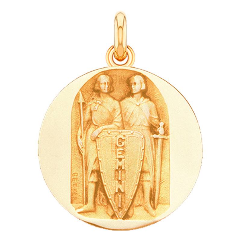 Cette médaille ronde sablée en Or Jaune 15 carats représente le signe du zodiaque des Gemeaux. Cette médaille possède deux finitions distinctes. Premièrement, nous avons une finition polie sur le fond de la médaille pour apporter brillance et éclat. La deuxième finition est une finition sablée appliquée sur le Saint afin de se différencier du fond de la médaille polie.