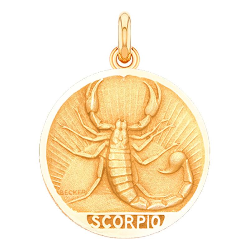 Cette médaille ronde sablée en Or Jaune 750/1000 (18K) représente le signe du zodiaque du Scorpion. Le signe astrologique du Scorpion, lié aux personnes nées entre le 23 octobre et le 22 novembre, est associé à la constellation du même nom. Ce signe correspond à un angle compris entre 210 et 240 degrés comptés sur l'écliptique (= le cercle des signes du zodiaque) à partir du point vernal.
