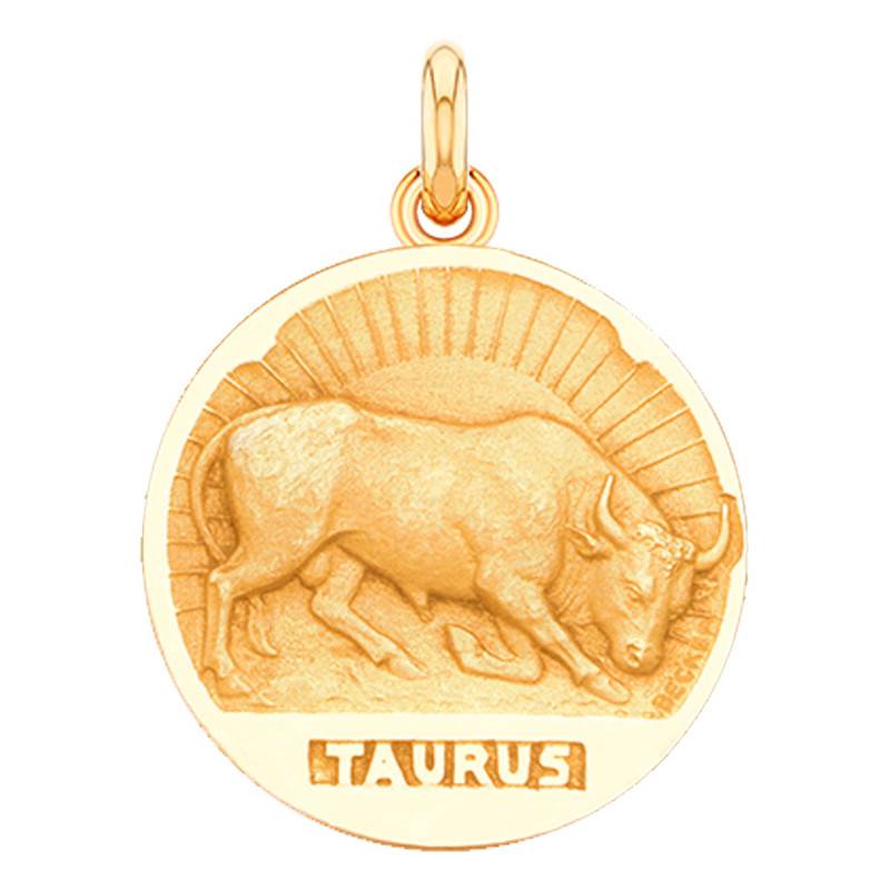Cette médaille ronde sablée en Or Jaune 750/1000 (18K) représente le signe du zodiaque du Taureau. Le signe astrologique du Taureau, lié aux personnes nées entre le 21 avril et le 21 mai, est associé à la constellation du même nom. Ce signe correspond à un angle compris entre 30 et 60 degrés comptés sur l'écliptique (= le cercle des signes du zodiaque) à partir du point vernal.