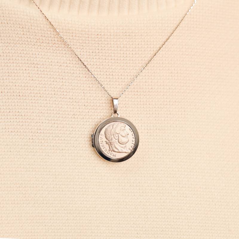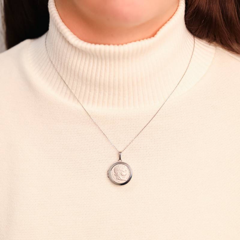 Ce superbe médaillon en argent 925 rhodié est un bijou unique et à symbolique historique. Raffiné et charmant, il est proposé en teinte rose doré, prend une forme ronde et dévoile la gravure de la tête Napoléon III accompagnée de son nom sur le pourtour. C'est une figure emblématique qui a marqué son époque. Avec un diamètre de 22,00 mm, il intègre également un emplacement photo dans lequel vous pourrez insérer le souvenir d'un proche. Son poids d'argent est de 6,60 grammes et vous pourrez l'associer à une chaîne un effet distingué à votre cou. C'est un grand classique qui signera votre prestige au quotidien.