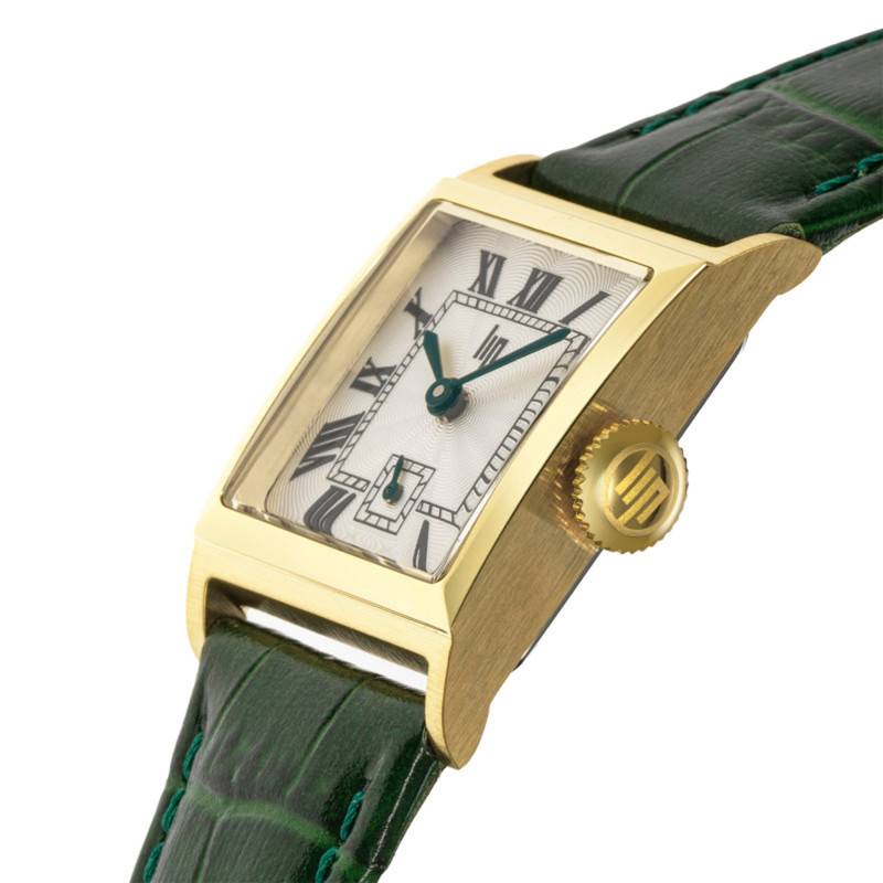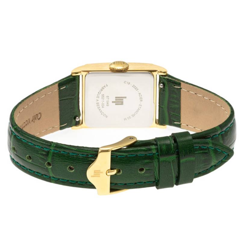 Cette montre Lip Churchill C18 est un exemple éloquent de sophistication avec un boîtier carré en PVD jaune mesurant 21 mm, une dimension idéale pour un poignet féminin. Le poids total de 23 g en fait un accessoire léger, parfait pour un port quotidien. La montre est conçue en France, ce qui témoigne d’un savoir-faire horloger exceptionnel. L’élégance du boîtier est sublimée par une finition brossée, particulièrement visible sur le cadran et rehaussée par la couleur jaune du revêtement. Le fond de boîtier est emboîté, garantissant une bonne protection du mécanisme interne. Le bouton remontoir situé stratégiquement facilite le réglage de l’heure.