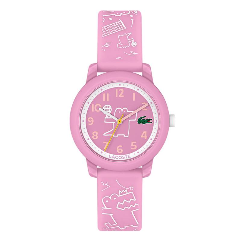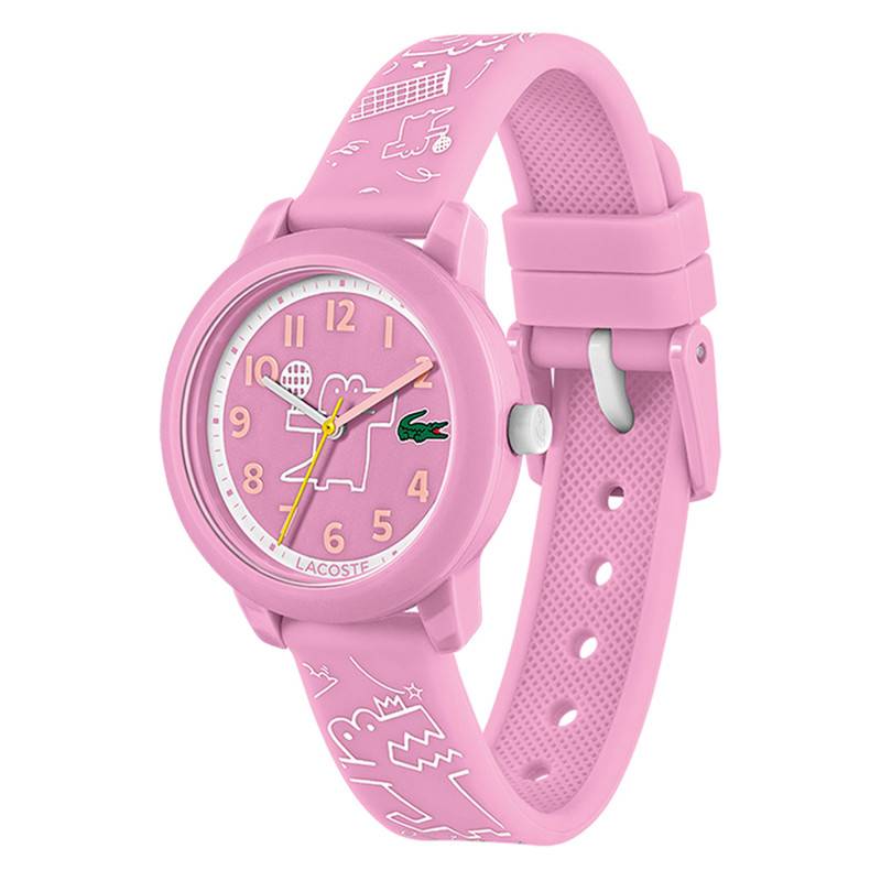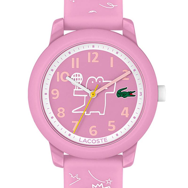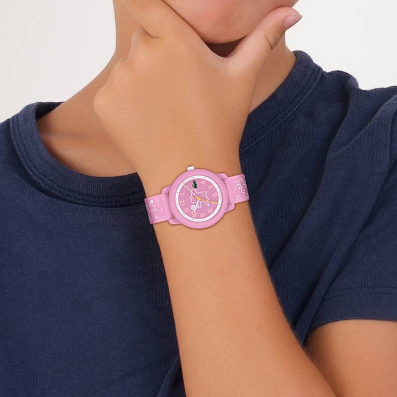 Le cadran de cette montre Lacoste ne manque pas d'attirer l'attention par son design ludique et sa finition mate. La couleur rose domine cette pièce, créant une harmonie chaleureuse et joyeuse. Au centre du cadran, se trouve un dessin captivant d'un dinosaure sur deux pattes tenant un ballon, une représentation qui ne manquera pas de séduire les jeunes amateurs d'aventures. Les chiffres arabes viennent entourer ce motif central, assurant une clarté et une lisibilité optimales. Chaque index est intelligemment agencé pour guider l'œil sur une lecture rapide de l'heure, complété par un chemin de fer minutieusement intégré. Le verre minéral protège ce cadran vibrant, assurant ainsi une résistance accrue aux rayures courantes.