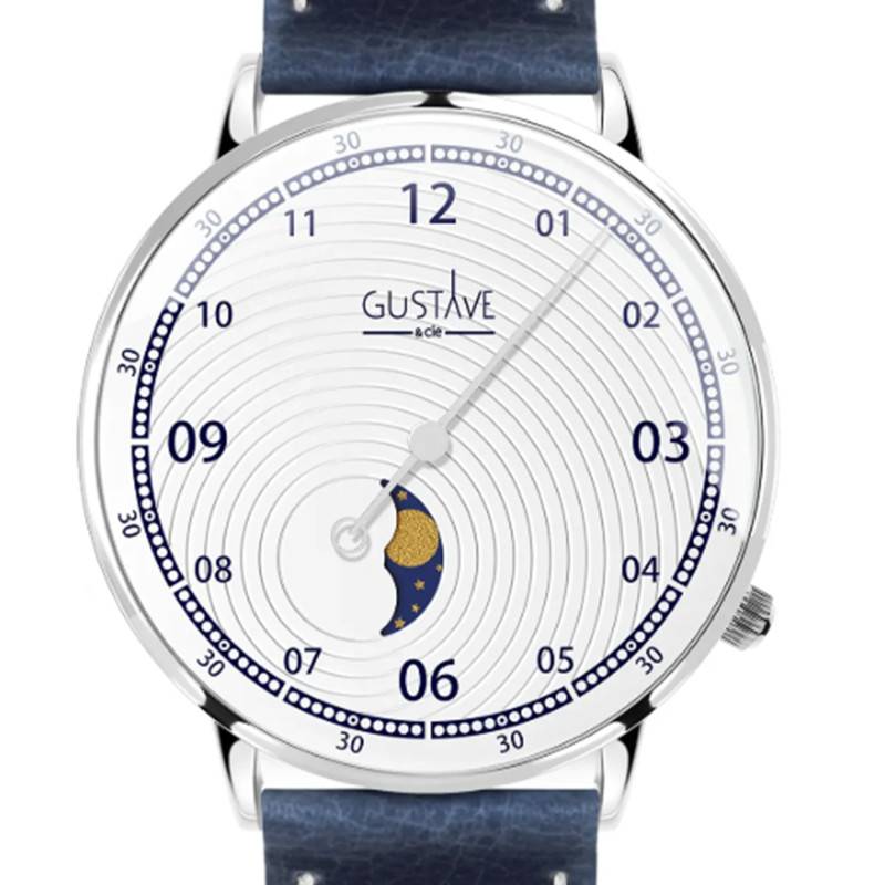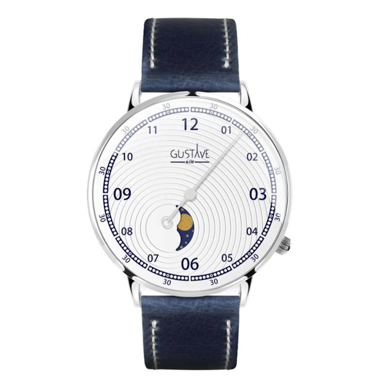Le cadran blanc de la montre se distingue par ses lignes guillochées, apportant une dimension de profondeur et de raffinement. On y trouve des chiffres arabes en bleu qui se détachent avec élégance, facilitant la lecture de l'heure. Il présente également une complication phase de lune qui ajoute une touche poétique et élégante. L'affichage est assuré par une seule aiguille centrale, système mono aiguille qui confère à cet accessoire un design résolument moderne, tout en restant fidèle à une tradition horlogère. Un petit bouton remontoir sur le côté assure le réglage, soulignant encore la simplicité et l'élégance de cet équipement.