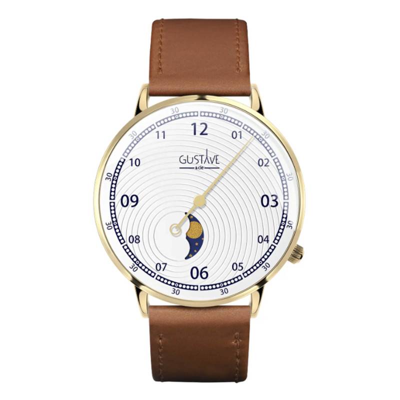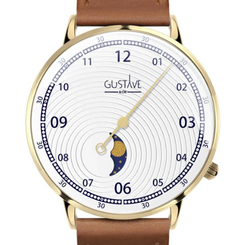 Le cadran de cette montre est un véritable hommage à l'art horloger avec sa finition guillochée qui capte la lumière de manière somptueuse. De couleur blanc, il arbore de magnifiques chiffres arabes bleus qui apportent une lisibilité parfaite. Une complication admirable, la phase de lune, ajoute une dimension supplémentaire d'élégance et de sophistication. En son cœur, une mono aiguille parcourt le cadran, indiquant les heures et les minutes de façon innovante et précise. La marque Gustave & Cie est subtilement inscrite sur ce cadran, rehaussant le prestige de cette pièce.