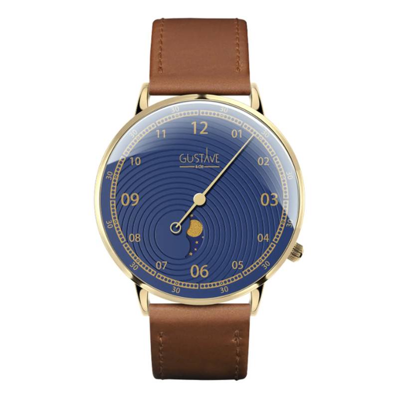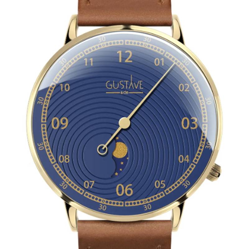 La montre Gustave & Cie dévoile un design qui allie avec brio la tradition horlogère et l'élégance contemporaine. Ce modèle est fabriqué en France, intégrant des matériaux de qualité tel que l'acier inoxydable 316L. Le boîtier, avec sa forme ronde, affiche un diamètre de 40 mm et une épaisseur de 10 mm, conférant une présence discrète mais affirmée au poignet. La finition polie et PVD jaune apporte une lueur dorée sophistiquée qui capte subtilement la lumière.