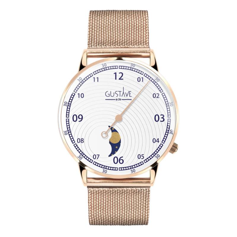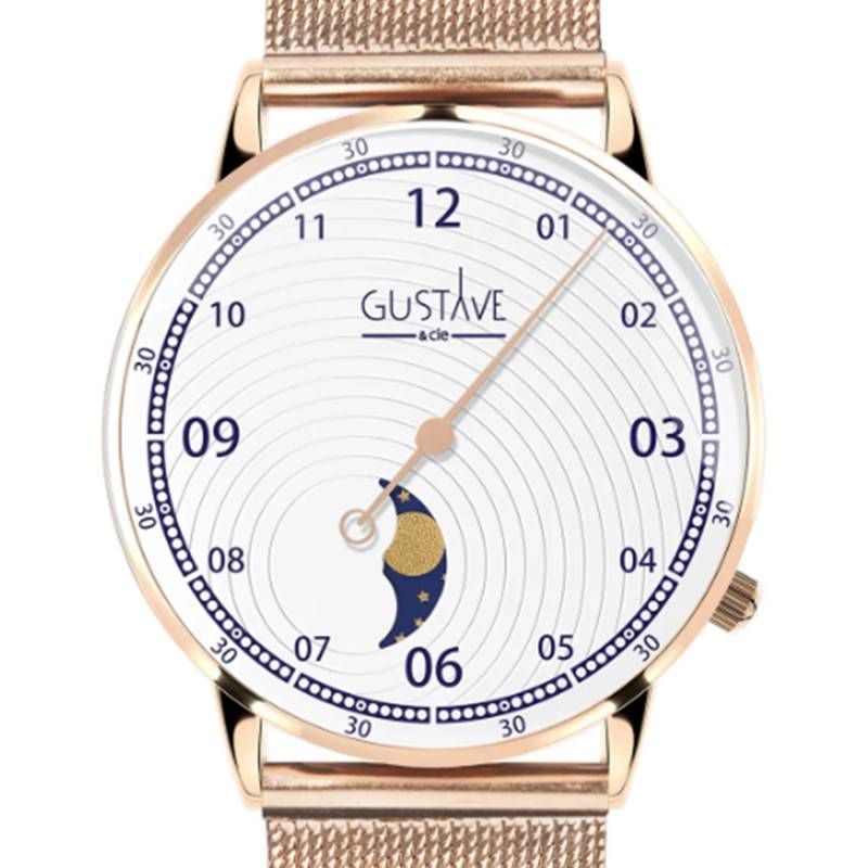 La montre Gustave & Cie se distingue par son esthétique raffinée et intemporelle. Son boîtier rond en acier inoxydable 316L, sublimé par une finition PVD or rose polie et brillante, attire immédiatement le regard. Avec un diamètre de 36 mm, elle s'adapte parfaitement au poignet, tandis que son épaisseur de 10 mm assure une présence discrète et élégante. La montre arbore un verre bombé en saphir, reconnu pour sa resistance aux rayures et sa capacité à offrir une clarté inégalée. Ce modèle, fabriqué en France, reflète une expertise horlogère indéniable. Cette montre est destinée à séduire autant les hommes que les femmes, grâce à son design unisexe.