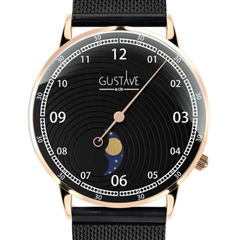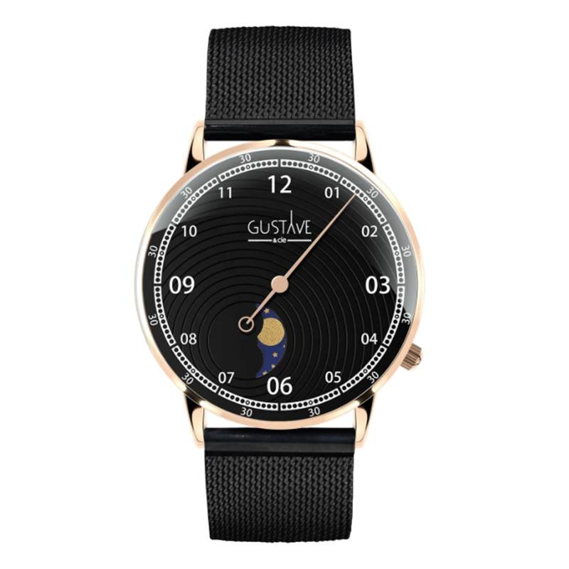 Le cadran est un point fort de cette montre, avec sa finition guillochée qui ajoute de la profondeur et un attrait visuel inégalé. Il est de couleur noir, créant un contraste somptueux avec le boîtier en PVD rose. Le cadran arbore une phase de lune élégante qui accentue son originalité. Les chiffres arabes sont clairs et facilement visibles, facilitant la lecture du temps. La montre se distingue par son affichage mono aiguille, qui allie style et simplicité en indiquant les heures et les minutes sur une seule aiguille.