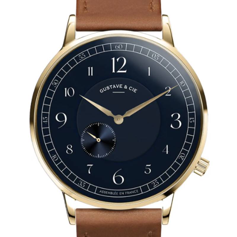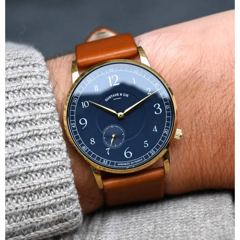 La montre Hector Or & Bleu de Gustave & Cie se distingue par son élégance intemporelle et ses lignes épurées. Le boîtier rond de 40 mm de diamètre, fabriqué en acier inoxydable et rehaussé d'une finition PVD jaune polie, confère à ce garde-temps un aspect luxueux et raffiné. Cette merveille d'horlogerie, témoin d'une fabrication française à la pointe de l'innovation, séduira les amateurs de montres à la fois chics et modernes. Avec une épaisseur de seulement 8 mm, cette montre s'adapte parfaitement aux poignets, même les plus fins.