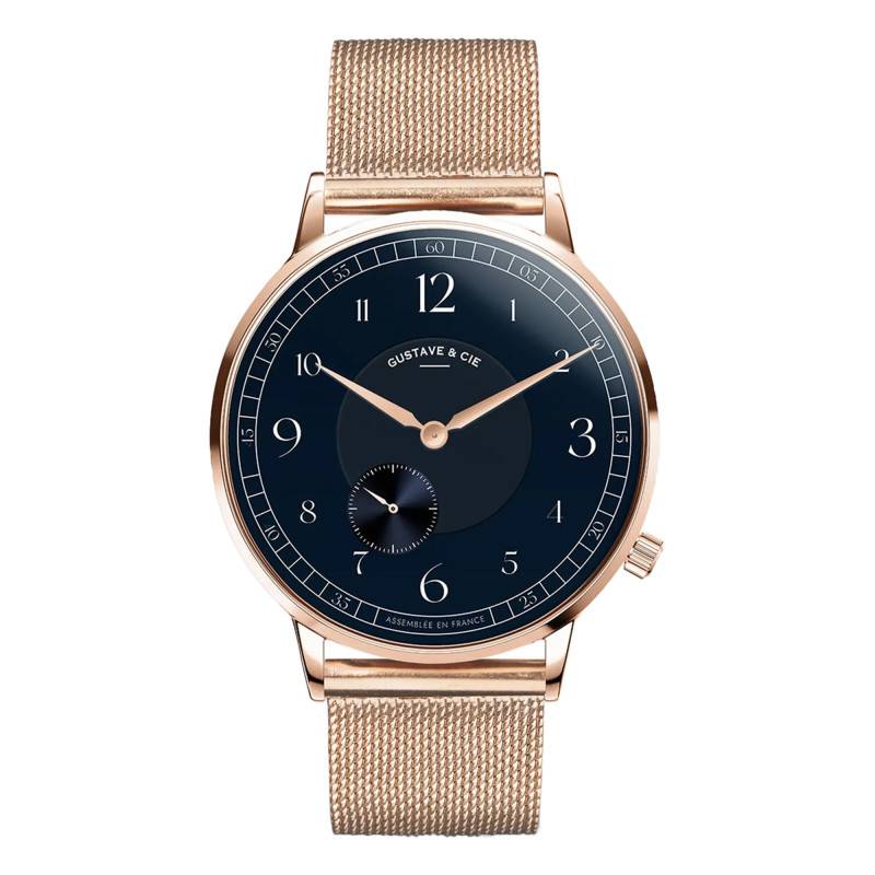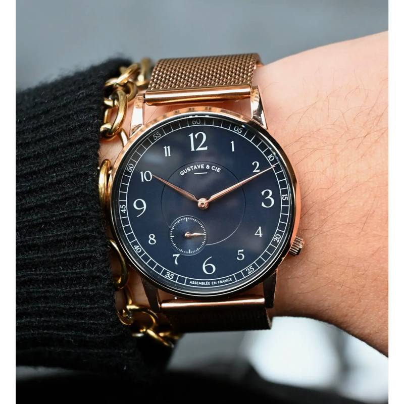 Gustave & Cie nous présente un garde-temps aussi rafraîchissant qu'élégant avec la montre 12H Hector. Dans une silhouette raffinée au caractère distinctif, le boîtier rond de 36 mm en acier inoxydable se pare d'une subtile finition en PVD or rose, lui conférant une allure à la fois moderne et intemporelle. Chaque centimètre de cette pièce est minutieusement conçu pour plaire à l'œil, avec une épaisseur de seulement 8 mm, offrant une légèreté et une finesse qui s'accordent parfaitement à son style. Fabriquée avec soin en France, cette montre bénéficie d'un verre saphir bombé qui protège des rayures. Un bouton remontoir se dresse discrètement sur le côté, soulignant la simplicité et l'efficacité du design tout en garantissant un réglage facile et fluide de l'heure.