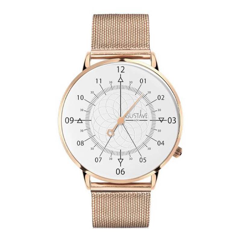 La marque Gustave et Cie est une maison horlogère originaire de l'hexagone qui vous propose de découvrir de nombreuses montres 12 heures ou 24 heures. Aujourd'hui, le modèle qui vous est présenté est issu de la collection Louis. Cette collection est un hommage au roi soleil qui a su marquer son époque et s'ancrer dans l'histoire française. Ce garde-temps d'exception fera succomber les hommes comme les femmes grâce à son boîtier en acier inoxydable recouvert de PVD or rose. Son diamètre de 40 millimètres et son épaisseur de 8 millimètres épouseront parfaitement les courbes de votre poignet. Au niveau des quatre heures, vous retrouverez la couronne remontoir qui vous permettra de régler les aiguilles de votre montre avec une grande facilité. Afin de préserver l'intégrité du cadran, un verre saphir a été sélectionné. En effet, cette matière sera très résistante face aux chocs et rayures de la vie quotidienne. Enfin, le fond de boîte emboîté assurera une étanchéité de 3 atmosphères.