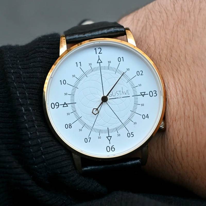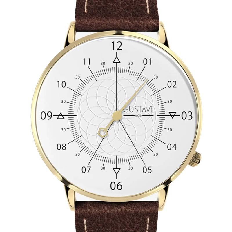 La collection de montres Louis développée par la maison française Gustave et Cie rend hommage au Roi Soleil et au célèbre Louis XVI passionné d'horlogerie. Ce modèle blanc et or au bracelet en cuir marron apporte de la nouveauté à la gamme. Ce garde-temps lumineux arbore un boîtier rond mesurant 40 millimètres de diamètre pour une épaisseur de 8 millimètres. Il épouse tous les types de poignets et s'adapte à la fois aux hommes et aux femmes. Ce dernier est conçu en métal avec un revêtement PVD or jaune pour davantage d'éclat. A 4 heures, vous retrouverez une couronne remontoir qui permet de régler l'unique aiguille indiquant les heures et les minutes. Le cadran est surplombé par un verre saphir aux propriétés inrayables pour lutter contre les chocs.