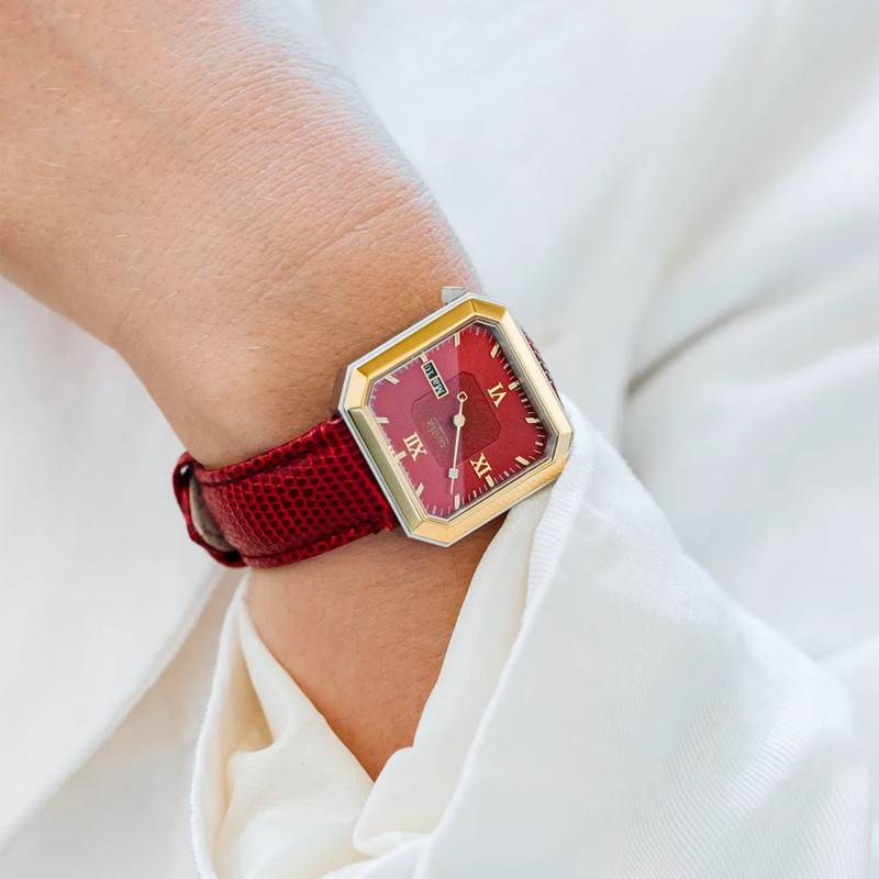 Le cadran grenat de cette montre est d'une beauté saisissante. Sa finition grainée capte la lumière de manière subtile, offrant des jeux de textures somptueux. Orné de chiffres romains dorés, le cadran affiche une allure à la fois classique et contemporaine. Les index intégrant le traitement SuperLuminova garantissent une lisibilité parfaite même dans l'obscurité. Un guichet placé à 3 heures permet d'afficher la date et le jour. La présence d'une mono aiguille dorée ajoute une touche unique qui attire immédiatement l'attention.