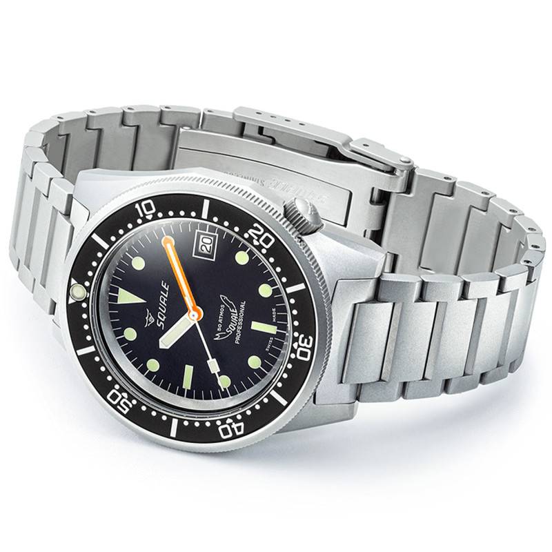 Réputée pour ses montres de plongée depuis sa création en 1950, la marque suisse Squale se distingue par son expertise horlogère de haut niveau. Ses créations sont soumises à des tests continus pour des niveaux d'étanchéité élevés, ce qui les rend parfaitement adaptées aux amateurs de plongée. La marque propose régulièrement des modèles performants qui vous accompagneront lors de vos plongées et vous indiqueront l'heure avec grande précision. C'est le cas de cette montre 1521 Black Blasted Bracelet 1521BKBL.SQ20S. Cette dernière est équipée d'un boîtier rond en acier inoxydable 316L sablé. Les dimensions de celui-ci sont de 42 mm de diamètre, 12,50 mm d'épaisseur et 48 mm de longueur, ce qui le rend idéal pour les poignets masculins. Un verre saphir plat protège le cadran contre les rayures et les chocs en arborant un traitement antireflet pour une lecture claire des éléments centraux sous tous les angles. Les heures et les minutes ainsi que la date peuvent être réglées à l'aide de la couronne crantée et vissée positionnée à 4 heures. Ce garde-temps dispose d'une lunette de plongée unidirectionnelle au design cranté. L'insert en aluminium noir de celle-ci est gradué par une échelle des minutes avec un marqueur luminescent.