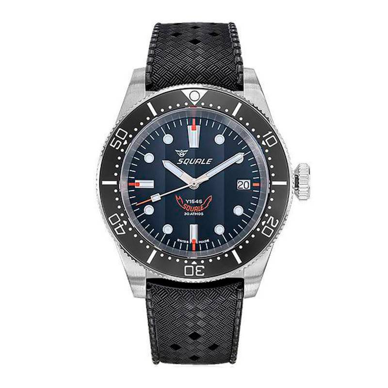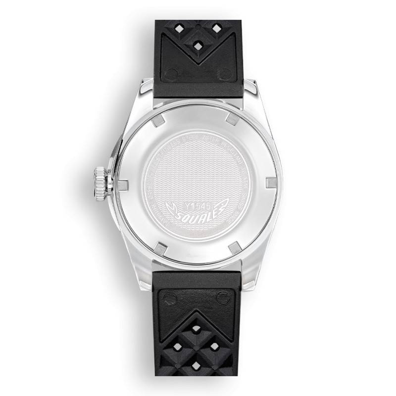 La marque Squale propose depuis 1959 exclusivement des montres de plongée. D'année en année, elle a su développer son savoir-faire. Référence parmi les professionnels de plongée sous-marine, la marque est un incontournable de tout passionné de plongée ou d'horlogerie. Dans la pure continuité de son identité, la maison est heureuse de vous faire découvrir la montre 1545 Black Rubber 1545BKBKC.HT. Entièrement élaboré en acier inoxydable 316L, l'acier des horlogers, le boîtier de cette montre saura braver la plupart des chocs. Vous pourrez admirer les délicates attentions apportées aux finitions, avec une alternance entre faces polies et brossées. Mesurant 40 mm de diamètre et disposant d'une épaisseur de seulement 12 mm, c'est une montre aux dimensions que l'on pourrait qualifier de parfaites. En effet, elle saura aller sur tous les types de poignet. Dans le but de protéger efficacement le cadran, un verre saphir plat avec traitement anti-reflet est présent. Authentique montre de plongée, cette montre est équipée d'un outil fort apprécié par les plongeurs, une lunette tournante unidirectionnelle sur 120 clics. Son insert, de couleur noire, est gradué sur 60 minutes. La couronne de remontoir est placée à 3 heures, elle vous servira à régler l'heure et la date. Le fond de boîte est vissé, participant à l'excellente étanchéité à 30 ATM, soit 300 mètres, de la montre.