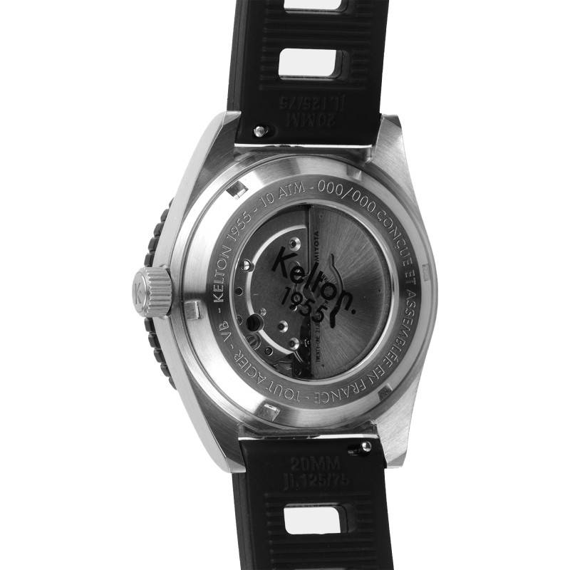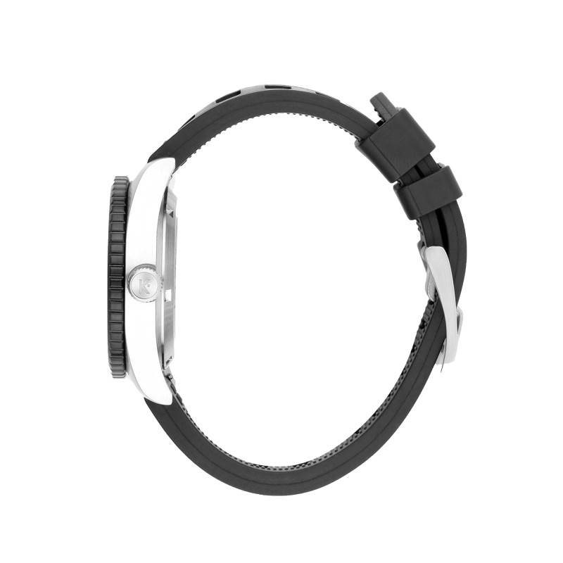 Le bracelet en caoutchouc noir fait de cette montre un modèle de confort et de tenue. Sa nature flexible et robuste épouse la forme du poignet, offrant un confort sans pareil, même lors d'activités physiques intenses ou de longue durée. Le choix du caoutchouc n'est pas anodin, car ce matériau est renommé pour sa résistance à l'eau, sa légèreté et sa facilité à absorber les chocs. Sa largeur dans l'entrecorne assure une harmonieuse continuité, se prolongeant vers une fermeture à boucle ardillon, classique et fiable, permettant un ajustement précis et sécurisé.