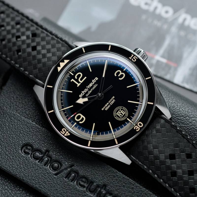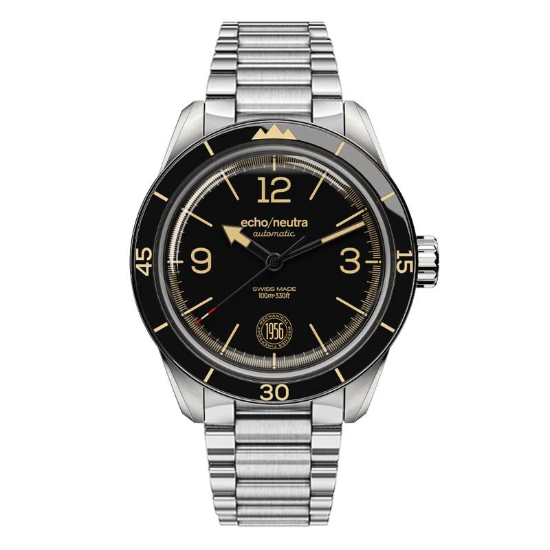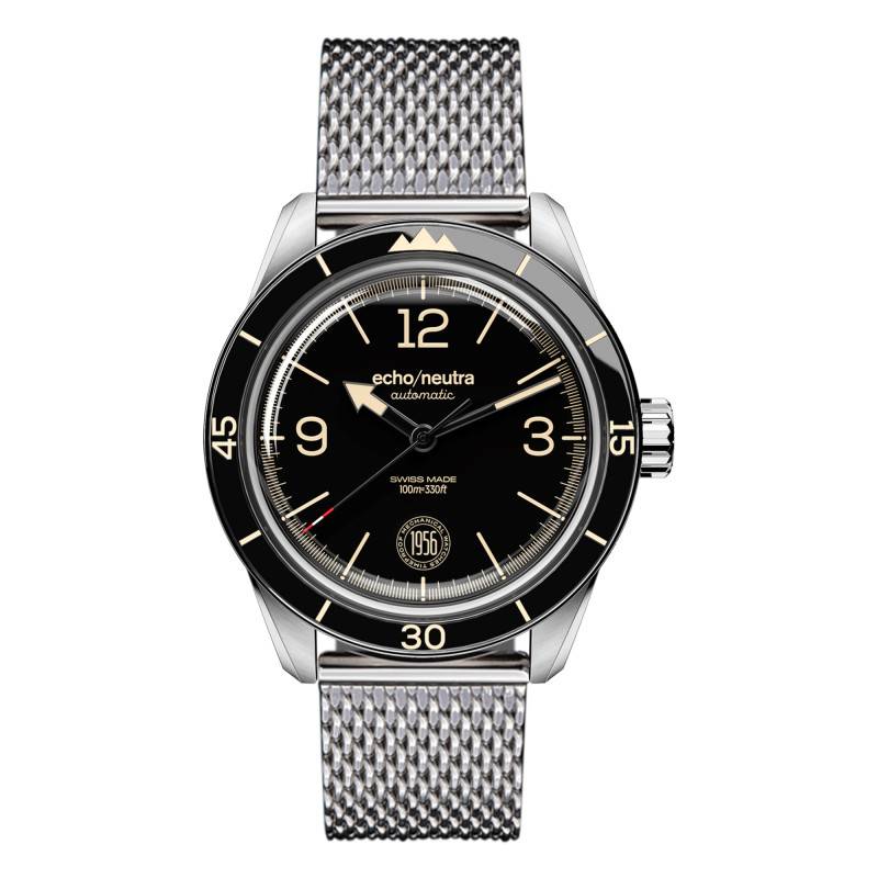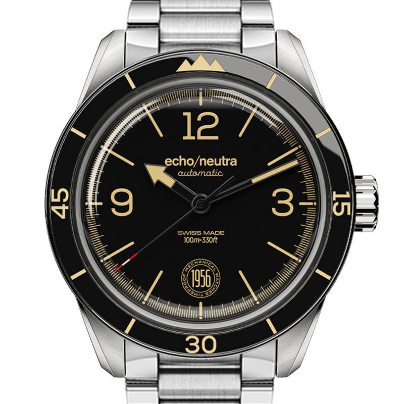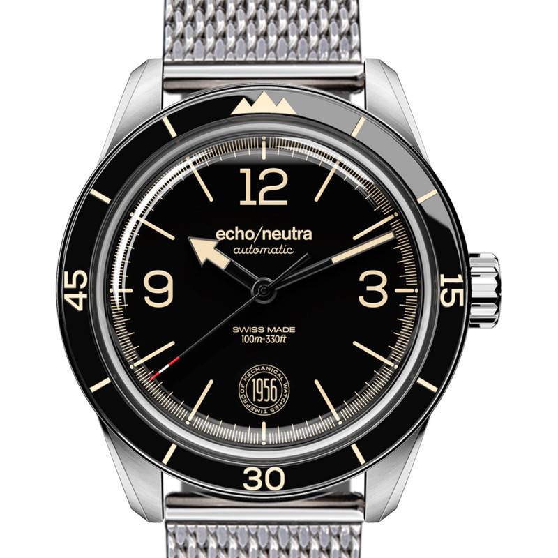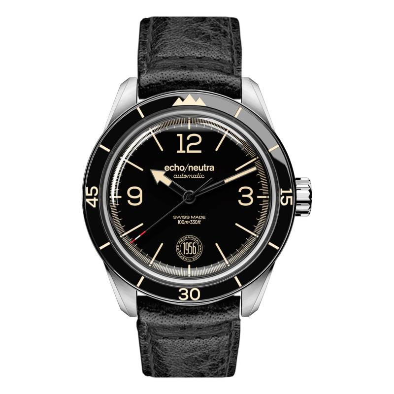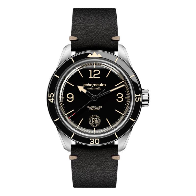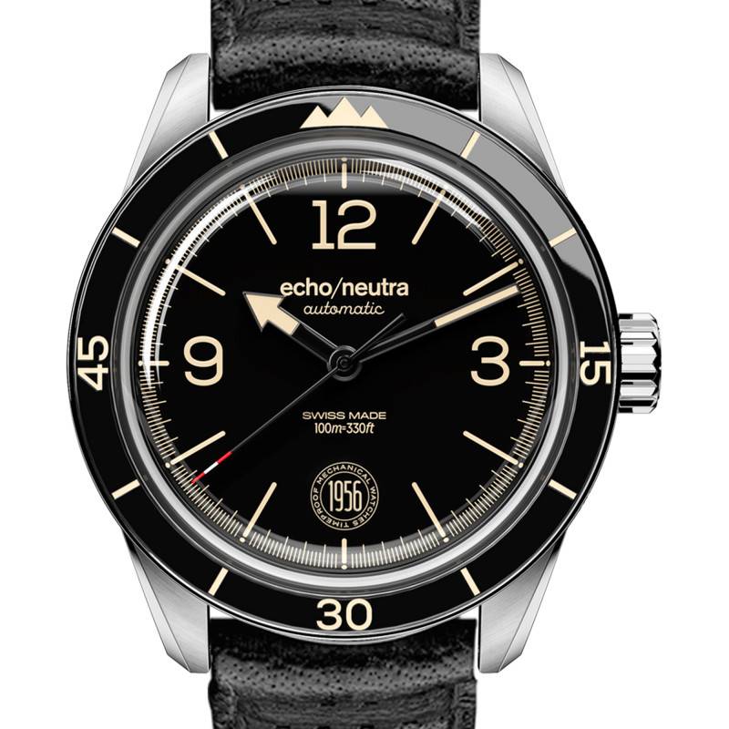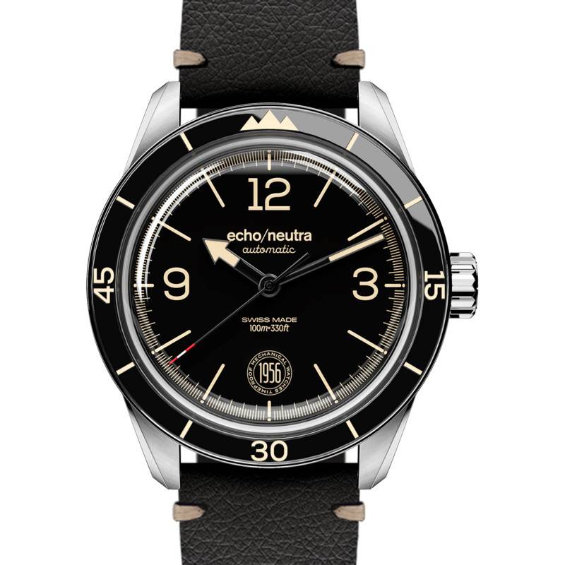 La manufacture Echo/Neutra vous présente le fruit de sa dernière création la 1956 3H. Son boitier rond en acier inoxydable mesure 40mm de diamètre, tandis qu'il fait 11,9mm d'épaisseur. Elle possède un verre saphir, grand gage de qualité, son fond de boîte est vissé et elle est reliée au poignet par un bracelet nato noir. Le modèle est mis en valeur par les coloris vintage noir et beige, tandis qu'il affiche un look sobre et élégant. Sa lunette de couleur noir brillant s'accorde aux tons mats des éléments du cadran et de la lunette. La couronne remontoir vissée en acier est située à 3 heures, venant parfaitement s'insérer dans le design de cette montre. La lunette fixe est noire, tandis que la graduation est beige sur un ton vintage. Résistante jusqu'à une profondeur de 100 mètres, elle saura vous accompagner partout.