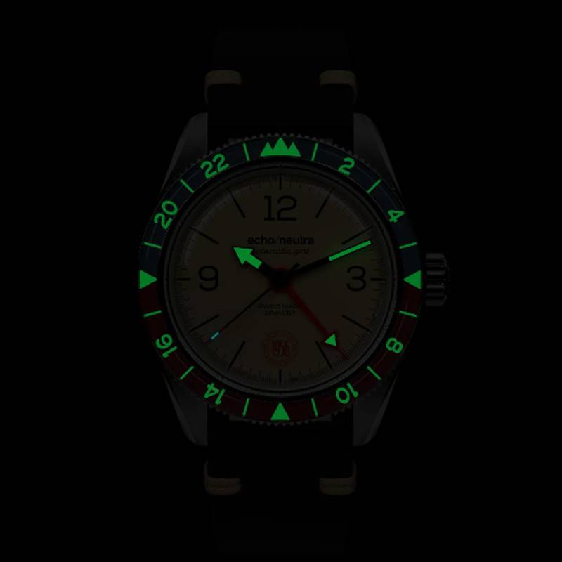 Le cadran de cette montre est un modèle de sophistication, d'un superbe beige mat qui contraste magnifiquement avec les chiffres arabes noirs et les aiguilles luminescentes. Les index sont rehaussés par un chemin de fer offrant une clarté de lecture inégalée. Pour accentuer la fonctionnalité et le style, chaque élément est traité avec un revêtement SuperLuminova BG W9, permettant une lecture aisée dans des conditions de basse luminosité. Le verre bombé en saphir, quant à lui, associe à merveille esthétisme et résistance. La montre introduit aussi une complication GMT, idéale pour les voyageurs qui souhaitent garder un œil sur un second fuseau horaire.