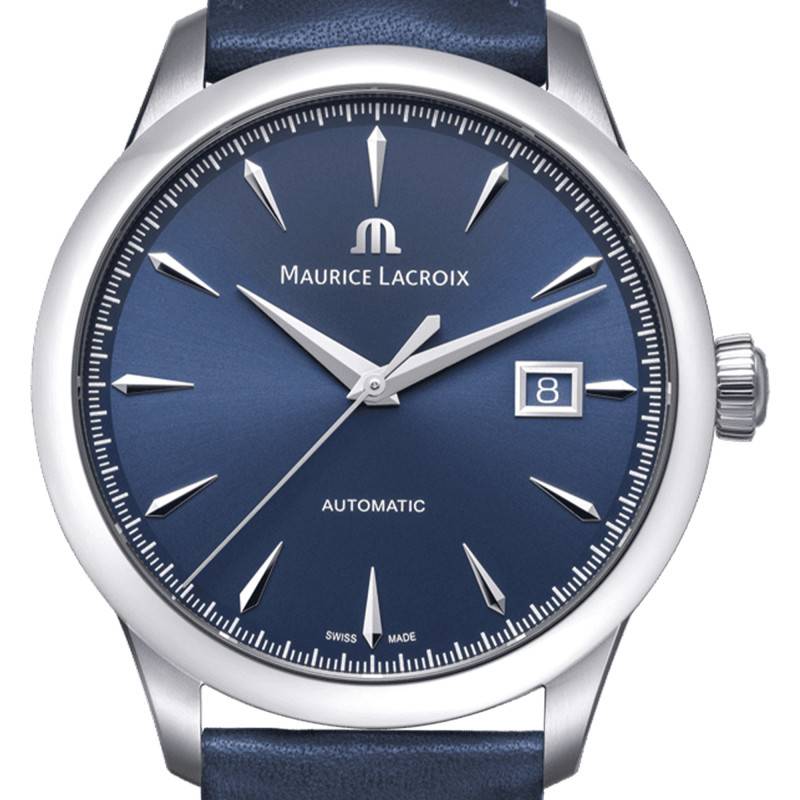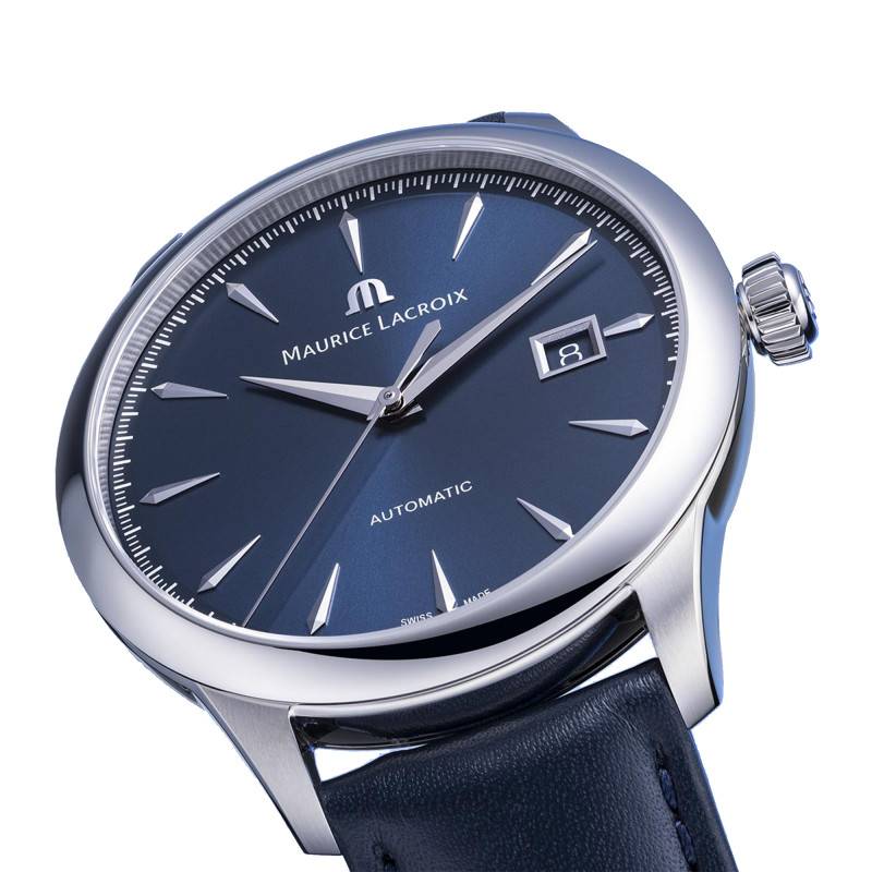 Le cadran de cette montre Maurice Lacroix est un véritable spectacle pour les yeux. Sa finition soleillée reflète la lumière avec éclat, créant des jeux subtils qui captent l'attention. Le bleu profond du cadran, associé à des index bâtons argentés, apporte une touche de modernité et de sophistication. Les aiguilles de type dauphine, effilées, parcourent le cadran avec élégance, assurant une lisibilité parfaite des heures, minutes et secondes. Un guichet date est positionné à 3 heures, offrant une fonctionnalité supplémentaire tout en conservant l'équilibre esthétique du design.