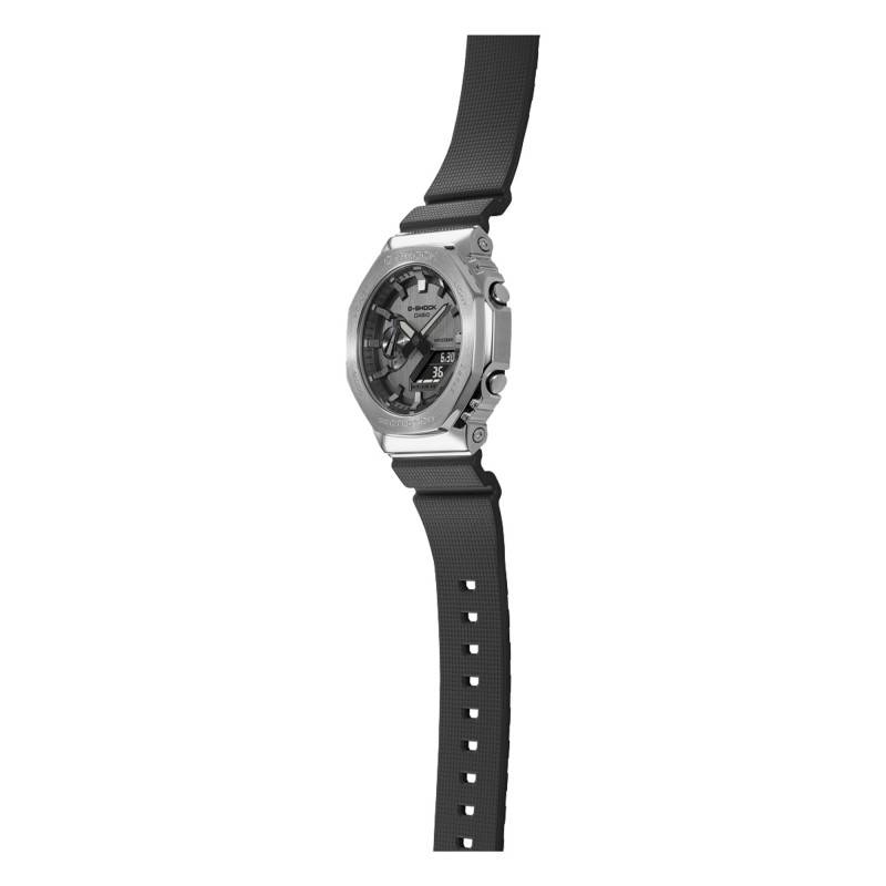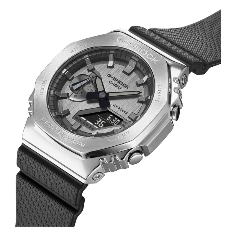En 1981, la Maison Casio imagine une toute nouvelle gamme, plus résistante aux chocs, qu'elle appelle G-Shock, diminutif de "Gravitational Shock". La montre 2100 Métal GM-2100-1AER est imposante et robuste. Elle arbore un boîtier de 44,4 mm de largeur pour 49,3 mm de longueur, conçu en acier inoxydable argenté et renforcé en fibre de carbone. Il mesure 11,8 mm d'épaisseur et pèse 72 grammes, ainsi il est idéal pour les courbes des poignets masculins. Le cadran, protégé des chocs et rayures par un verre minéral, se dévoile avec profondeur pour vous offrir un affichage analogique et digitalisé du temps. En effet, il s'équipe de deux aiguilles indiquant les heures et les minutes via des index bâtons et un chemin de fer. Situé à 9h, un compteur précise le jour de la semaine en lettres anglaises. Un compteur numérique s'inscrit dans la partie inférieure du cadran. Les boutons-poussoirs se situant sur les flancs droits et gauches du boîtier donnent accès à ces multiples fonctions telles qu'un chronomètre 1/100 s, un compte à rebours et des alarmes quotidiennes. Finalement, cette montre dispose d'un fond de boîte vissé lui permettant de rester étanche jusqu'à 20 atmosphères.