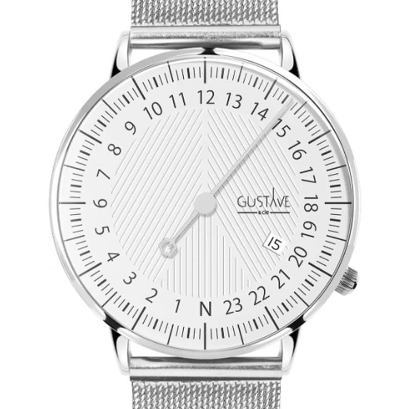 La montre Gustave & Cie illustre un design à la fois classique et contemporain, incarnant une sophistication discrète idéale pour l'homme moderne. Avec un boîtier circulaire en acier inoxydable 316L de 40 mm de diamètre, elle associe robustesse et esthétique grâce à sa finition polie et brillante. L'unique bouton remontoir placé à droite du boîtier allie fonctionnalité et design épuré.