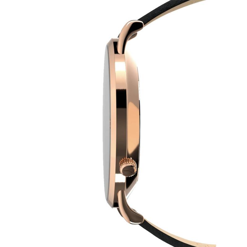 Cette montre abrite un cadran de couleur noire et de forme ronde. Sa finition guillochée donne davantage de modernité au modèle.Vous trouverez en son coeurune seule et unique aiguille couleur or rose, qui vous indiquera à la fois les heures, mais également les minutes par tranche de quart d'heure. Accompagnée par un chemin de fer des minutes et des chiffres arabes de couleur blanche, la précision de votre garde-temps sera digne de la qualité proposée par la marque. A 4 heures, vous trouverez également un guichet date pour davantage de repères temporels. La marque signe sa création à 3 heures, pour davantage d'authenticité.