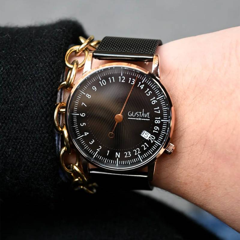 La fabrication française est le leitmotiv des concepteurs de la marque GUSTAVE & cie. Savoir-faire, qualité, proximité et réactivité sont des atouts et des critères de choix indispensables pour collaborer avec la marque. Elle vous présente son modèle mixte 24h, issu de la collection André en hommage à André Citroën, le premier homme à avoir inscrit son nom sur la tour Eiffel en 1925. Cette montre française bouleverse les codes avec élégance en revisitant le concept du cadran 24 heures utilisé par les militaires et les astronautes. Faite en acier inoxydable, cette montre dévoile un boîtier rond au revêtement PVD or rose et noir, mesurant 40 millimètres de diamètre et 8 millimètres d'épaisseur. Orné d'un verre saphir, le cadran résistera aux chocs et aux rayures, et vous assurera un confort indéniable grâce à son bracelet en milanais. Comme à son habitude, la marque dote le cadran d'une mono-aiguille 24 heures. Le réglage de votre montre se fera en toute facilitée grâce à son bouton-remontoir situé au niveau de l'index de 20 heures. Son fond de boîtier vissé vous assurera une étanchéité de 5 ATM, soit 50 mètres de profondeur.