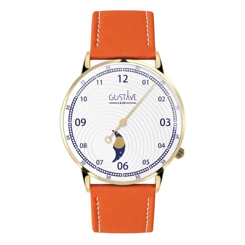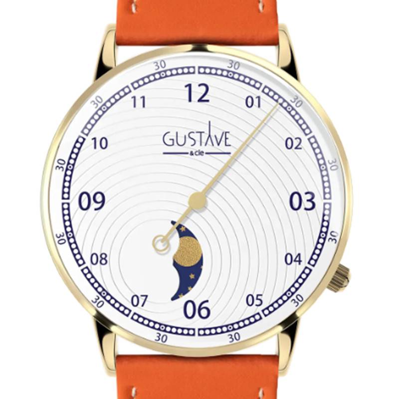 Cette magnifique montre Gustave & Cie arbore un boîtier rond en acier inoxydable 316L, reconnu pour sa robustesse. L'acier est ici sublimé par une finition PVD jaune qui lui offre une brillance parfaitement polie, ajoutant de l'éclat à l'ensemble. Le boîtier mesure 36 mm de diamètre pour une épaisseur de 10 mm, offrant des proportions idéales pour ceux qui recherchent un accessoire à la fois discret et distingué. Conçue et fabriquée en France, cette montre incarne le savoir-faire horloger de l'héxagone.