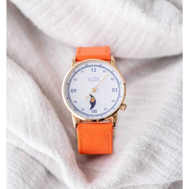 Le bracelet de cette montre apporte une touche de couleur unique et éclatante à l'ensemble. Fait en cuir de vachette de couleur orange, il se distingue par ses surpiqûres blanches qui apportent un contraste visuel saisissant. Avec une largeur d'entrecorne de 20 mm, il assure un confort optimal lors du port, épousant le poignet de manière ergonomique. Le fermoir à boucle ardillon, classique et efficace, permet un ajustement facile et sécurisant du bracelet.