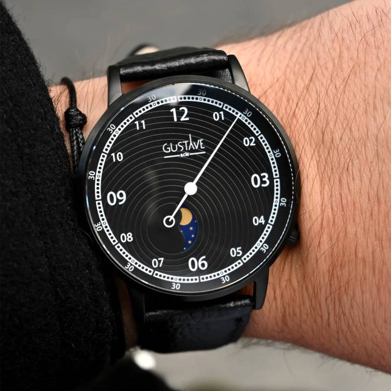 Gustave & Cie est une maison horlogère qui propose des montres au design unique et intemporel tout en rendant hommage à des personnalités françaises, d'où le nom de la marque qui fait référence à Gustave Eiffel. Ici, Gustave & Cie vous dévoile un modèle de sa nouvelle collection Georges. Nos jeunes créateurs de Dijon, ont voulu rendre hommage à Georges Méliès, célèbre illusionniste qui a notamment été connu pour avoir réalisé en 1902 "le voyage vers la lune". Avec cette nouvelle collection, c'est un voyage vers la lune que vous proposent les créateurs avec ce cadran phase de lune qui vous initie aux influences lunaires. Ce modèle présente un boîtier de forme ronde et de couleur noire en acier inoxydable et PVD noir. Avec ses 40 millimètres de diamètre, il ira aussi bien aux femmes qu'aux hommes, puisque ce modèle est mixte. Il saura charmer tout le monde par sa simplicité et son élégance. Pour protéger au mieux le cadran, un verre saphir le surplombe. Il protégera votre montre des éventuels chocs et rayures. Par ailleurs, située à quatre heures, vous trouverez une couronne remontoir qui permettra de régler les aiguilles facilement. Enfin, cette montre possède un fond de boîte emboîté qui vous assure une étanchéité de 5 atmosphères.