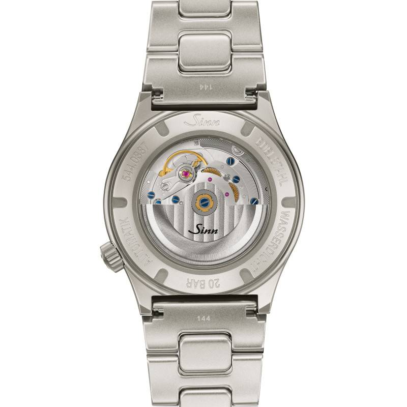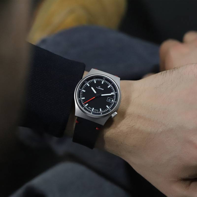 La montre, fabriquée par Sinn, est le fruit d'un savoir-faire allemand exceptionnel, conçu pour offrir une performance irréprochable. Le boîtier rond, en acier inoxydable, présente une finition mate satinée, conférant une allure raffinée et moderne. Avec un diamètre de 38,50 mm et une épaisseur de 10,10 mm, cette montre offre un équilibre parfait entre discrétion et présence. Pesant 59 g, elle promet d'être à la fois robuste et confortable. Une lunette en acier ceinture le cadran, ajoutant une dimension de solidité tout en complétant l'ensemble avec un raffinement discret. Le fond de la montre est vissé et transparent, il permet d'admirer le mécanisme en action à travers un verre saphir plat et antireflets, assurant protection et clarté à tout instant.