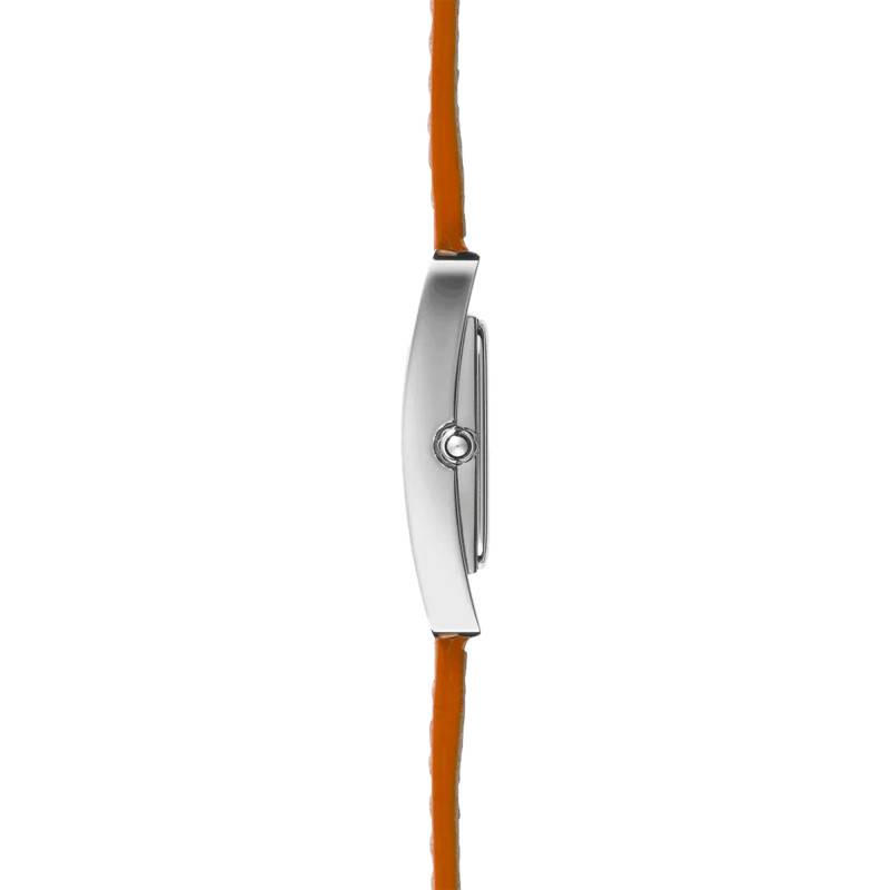 Cette montre est habillée par un magnifique bracelet en cuir véritable de couleur orange. Plus long que les autres, il pourra s'enrouler délicatement deux fois autour de votre poignet. Ses surpiqûres blanches lui apportent une finition de qualité et un brin de modernité. Vous pourrez l'attacher grâce à sa boucle ardillon argentée. Elle vous permettra de le régler à la taille de votre poignet pour un maintien optimal. Veuillez noter son entrecorne de 16 millimètres.