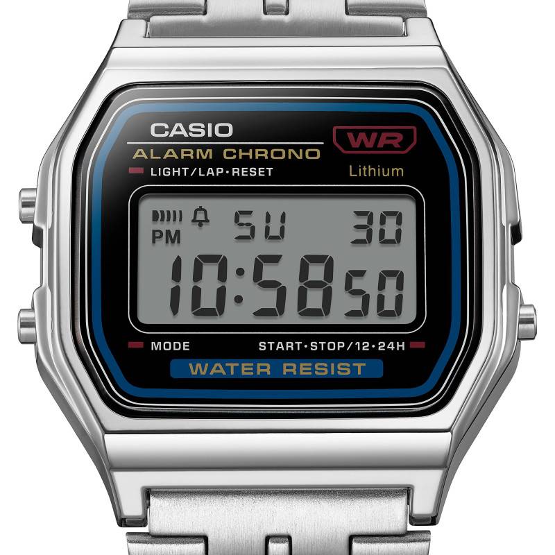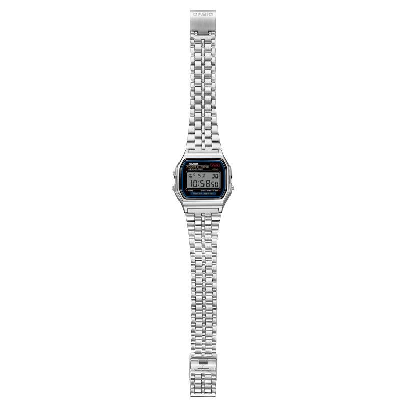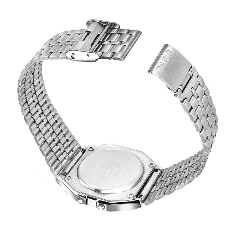 La montre Casio Vintage, modèle A159WE-1EF, se distingue par son élégance intemporelle et ses lignes épurées. Son boîtier est fabriqué en acier inoxydable, ce qui garantit une excellente résistance à la corrosion tout en offrant un aspect brillant et sophistiqué. La forme octogonale du boîtier, d'une longueur de 36,80 mm, d'une largeur de 33,20 mm, et d'une épaisseur de 8,50 mm, est à la fois raffinée et pratique pour un port quotidien. Pesant 45 g, la montre est légère et confortable au poignet. Le fond du boîtier, maintenu par des vis, assure une bonne protection et étanchéité. La montre dispose de trois boutons poussoirs pour naviguer aisément entre les différentes fonctions, offrant une utilisation intuitive et une adaptation parfaite aux exigences modernes du quotidien.