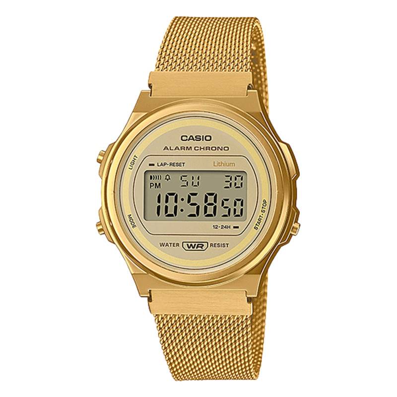 La Maison japonaise Casio, fondée il y a plus de 60 ans, ne cesse de se réinventer pour nous proposer des montres à la fois innovantes et de caractère ! Le modèle A171WEMG-9AEF, issu de la collection Casio Vintage séduira aussi bien la gent masculine que féminine avec son total look gold et son affichage digital de l'heure. Cette montre se pare d'un boîtier rond conçu en résine couleur or jaune. Il accueille un cadran rectangulaire qui dévoile un affichage numérique du temps. Ce dernier est protégé des chocs et rayures du quotidien par un verre acrylique. Sur le flanc droit et gauche du boîtier, les trois boutons-poussoirs permettent l'accès aux multiples fonctions de la montre. Parmi elles, vous découvrirez un chronomètre, une alarme, un calendrier, et bien entendu, les fonctions heures, minutes, seconde, jour et date. Cette montre dispose d'un fond de boîte de type "emboîté" qui lui permet de rester étanche jusqu'à 3 ATM.