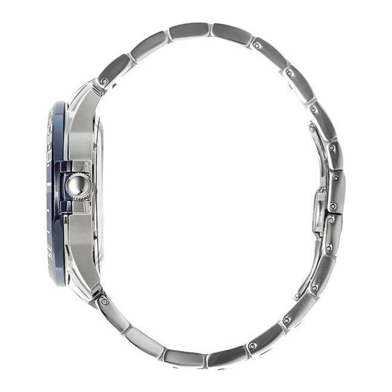 La montre s'habille d'un bracelet en acier inoxydable argenté. Composé de trois rangées de maillons, ce dernier épousera parfaitement les courbes de votre poignet. Pour une sécurité optimale, le bracelet est équipé par une boucle déployante simple avec fermoir de sécurité. L'entre-corne est de 24 millimètres.