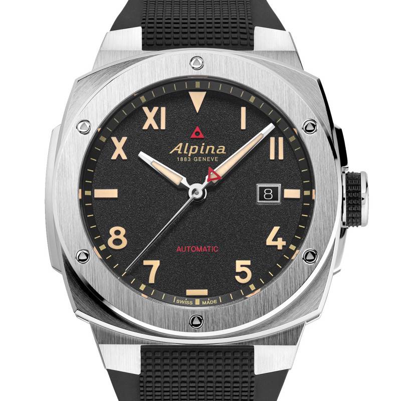 De forme ronde, ce cadran affiche un fond de couleur noire sublimé par une finition sablée. Son pourtour est habité par un rehaut gradué par un chemin de fer des minutes qui facilitera la lecture temporelle. Arborant une couleur argentée, les deux aiguilles en laiton placées au centre de ce cadran s'animent pour communiquer les heures et les minutes. Ces dernières, ainsi que les index appliqués en chiffres arabes et romains beiges qu'elles survolent sont revêtus d'un traitement luminescent Old Radium qui vous donnera la possibilité de lire l'heure même dans les milieux mal éclairés. La trotteuse grise au contrepoids triangulaire rouge également en laiton se charge de désigner les secondes. Pour compléter les fonctions de cette montre, un guichet date est installé à 3 heures. Alpina signe sa réalisation à midi avec son nom et son année de création.