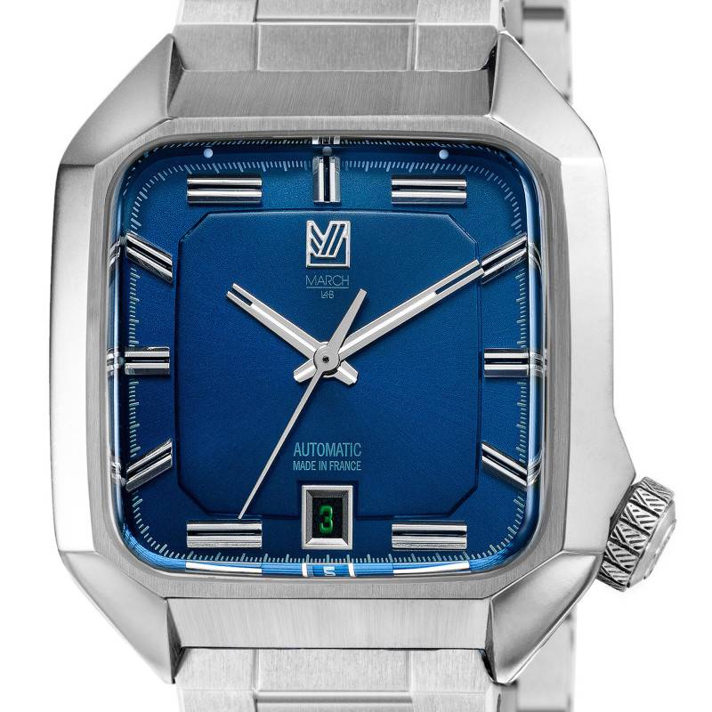 La maison française March La.b est parvenue à s'ancrer parfaitement dans le monde horloger grâce à son alliance entre esthétique élégante et références subtiles à l'univers dont il s'inspire : l'automobile. La forme du boîtier anguleuse semble pleinement être inspirée par les profils des carrosseries de cette époque. Cette AM2 Automatique Navy s'habille alors d'un design rétro puisé dans les années 1970. Son boîtier est en acier inoxydable 316L et dispose d'une finition alternée de poli / brossé très appréciable. Il assure la protection du cadran en l'entourant. Un verre saphir bombé vient l'aider, il se pose en son dessus et se dote d'un traitement anti-reflets permettant de lire l'heure confortablement en contrant les reflets du soleil. À l'arrière le fond de boîte est vissé et transparent. Le mouvement automatique franco-suisse est dévoilé depuis le verre de couleur verte faisant référence à la couleur emblématique de la maison. La couronne située à quatre heures est striée du logo de la marque et ressemble au bouchon de réservoir d'une voiture. Cette montre ne ressemble à aucune autre et représente parfaitement l'esprit March La.b mêlant les qualités horlogères au design atypique et esthétique.