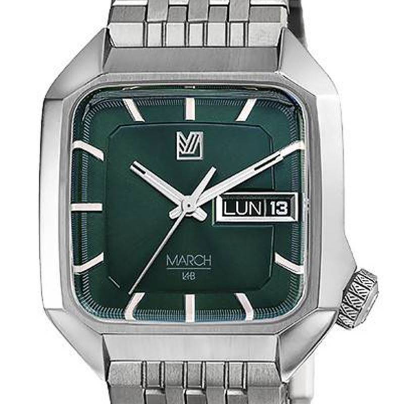 Le cadran carré de cette AM2 en fait tout son caractère. Sa finition brossée à la verticale, par-dessus ce vert profond à la fois sobre et raffinée, est soulignée par les éléments argentés qui viennent définir les heures et les minutes. Les index bâtons de grandes tailles indiquent les heures, tandis que le chemin de fer des minutes finement inscrit sur le fond indique les minutes. A la place de l'index bâton des 15 heures, vous trouverez un guichet date jour rectangulaire personnalisé tout spécialement pour la marque. Les aiguilles des heures et des minutes, toutes deux situées au centre se distingueront la nuit par leur faculté luminescente, tandis que l'aiguille consacrée aux secondes se distinguera par sa finesse et sa précision le jour. Au-dessus de ce trio d'aiguilles, vous retrouverez le délicat logo argenté de la maison française.