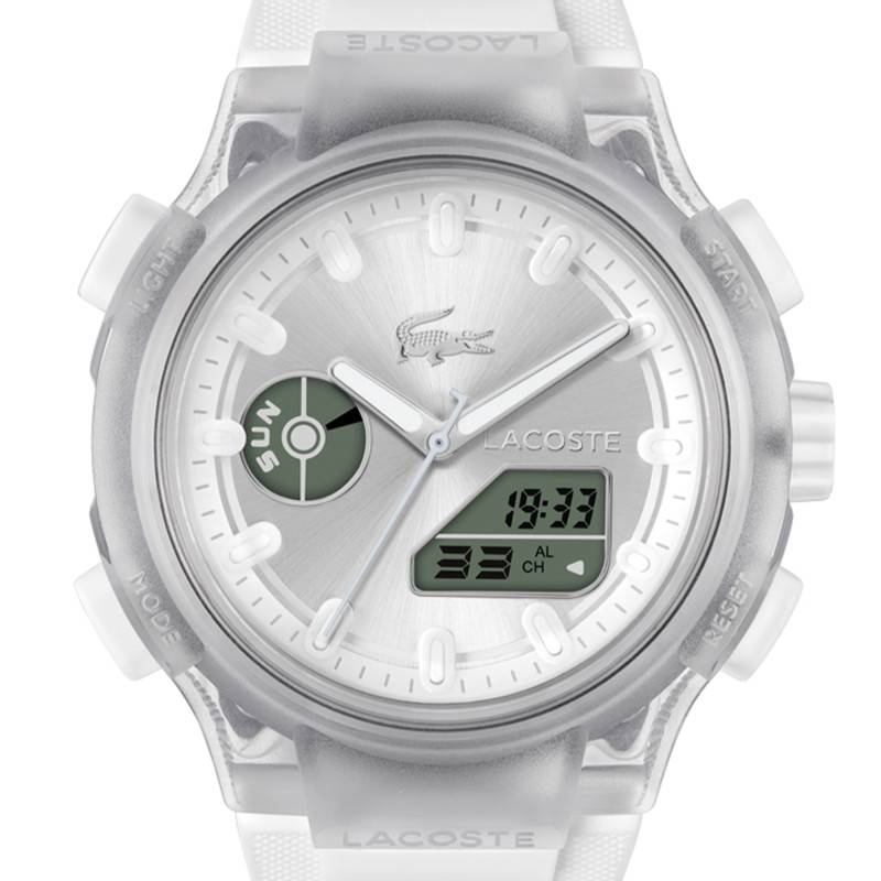Sous le boîtier de cette montre Lacoste se trouve un mouvement quartz offrant une précision exemplaire. Ce type de mécanisme est reconnu pour sa fiabilité et son efficacité, garantissant que votre montre indique toujours l'heure exacte avec un minimum d’entretien. Le modèle abrite plusieurs fonctionnalités avancées, comme le chronographe et le chronomètre au 1/100e de seconde, montrant sa capacité à allier esthétisme et performances techniques. Les capacités de ce mouvement incluent également un affichage 24 heures, une alarme-réveil qui permet d’intégrer cette montre efficacement dans votre routine quotidienne.
