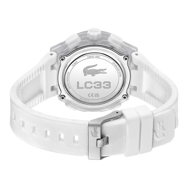 Le bracelet de la montre Lc33 est fabriqué en silicone de couleur blanche, modélisé pour offrir un confort inégalé et une durabilité accrue. Sa finition gaufrée ajoute une touche de texture qui rehausse son style moderne et dynamique. Mesurant 23 mm à l'entrecorne, le bracelet se fixe à votre poignet grâce à une boucle ardillon, reconnue pour sa simplicité d'utilisation et son efficacité. En plus de sa résistance, la matière silicone est largement plébiscitée pour sa capacité à résister aux éléments, en faisant ainsi un allié idéal lors de vos activités de plein air ou sportives.