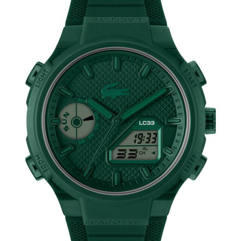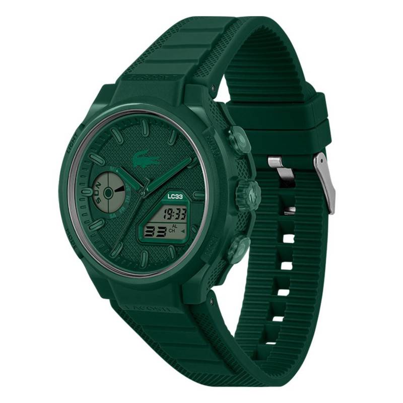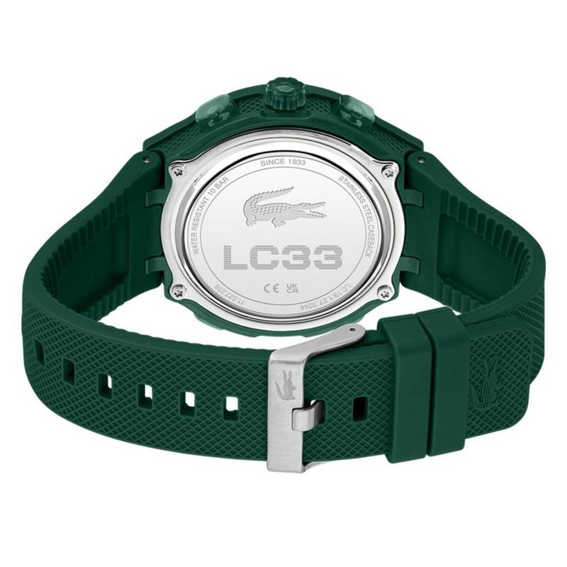 La montre Lacoste LC33 2011449 s'impose comme un véritable atout au poignet avec son allure verte audacieuse et son boîtier rond de 45 mm de diamètre. Conçue en acier inoxydable et en synthétique, elle associe robustesse et légèreté avec un poids de seulement 61 g. La montre se distingue par ses finitions polies et satinées, traduisant un souci du détail et de l'esthétisme. Sa couronne et ses quatre boutons-poussoirs sont ingénieusement intégrés au boîtier, facilitant ainsi les réglages des nombreuses fonctionnalités. Le fond maintenu par des vis assure une protection optimale des composants internes tout en facilitant l'accès pour d'éventuelles réparations.