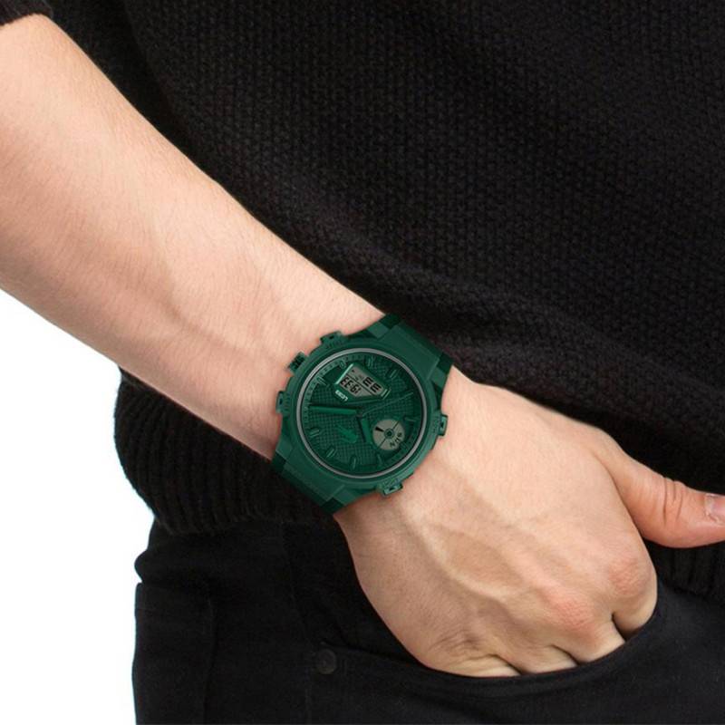 Le bracelet de cette montre est fait en silicone, offrant un confort incomparable et une résistance adaptée aux activités variées. Sa couleur verte s'accorde parfaitement avec l'esthétique générale du garde-temps, tandis que sa largeur de 26 mm assure une présence imposante au poignet. La boucle ardillon, classique et pratique, garantit une fermeture sûre tout en permettant des ajustements rapides. Le motif gaufré du bracelet ajoute une touche de style et rehausse l'ensemble de manière subtile, combinant flexibilité et durabilité pour un usage quotidien.