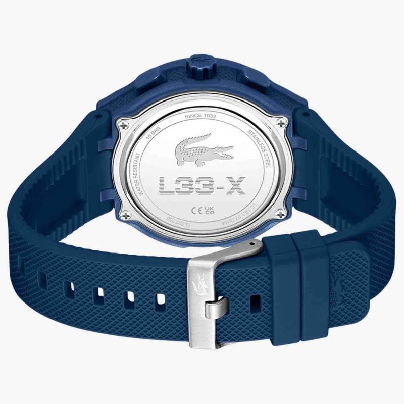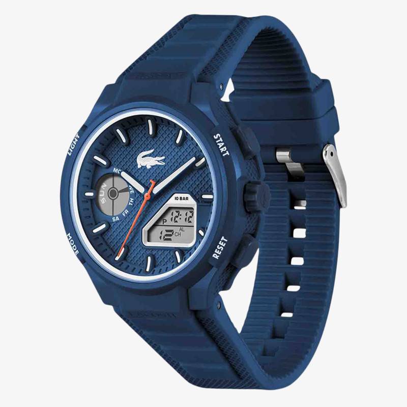 Lacoste est la marque des femmes et des hommes distingués qui souhaitent s'affirmer avec élégance et ressortir leur style singulier. Reconnue pour ses emblématiques polos piqués, elle propose à tous les passionnés de l'horlogerie des garde-temps de haute qualité qui se caractérisent par leur esthétique sport-chic et leur grande fiabilité. Faisant partie de la collection LC33, cette charmante montre 2011370 à affichage ana-digi s'affirme comme un incontournable ! Elle mêle style sport-chic et multifonctionnalités, faisant le grand plaisir des hommes souhaitant se démarquer. Vous pourrez la marier avec des tenues élégantes comme des looks décontractés en l'enfilant lors de toutes vos aventures. Ce modèle est pourvu d'un boîtier en acier inoxydable et en TR90 qui mesure 14,90 mm d'épaisseur pour un diamètre de 45 mm. Ce dernier arbore des finitions polie et brossée qui soulignent délicatement sa forme ronde et mettent en valeur sa couleur bleue. Il s'adapte à merveille aux poignets masculins et garantit un port confortable en toute occasion. Sa lunette est marquée par des inscriptions blanches indiquant les fonctions des quatre boutons poussoirs placés sur la carrure guillochée au motif piqué. Ces derniers sont accompagnés par une couronne bleue, servant tous au réglage de l'heure et des diverses fonctionnalités de la montre. Par ailleurs, un verre minéral passe par-dessus le cadran et au verso, se dévoile un fond de boîte maintenu par quatre vis qui assure une résistance à l'eau à une profondeur de 100 mètres.