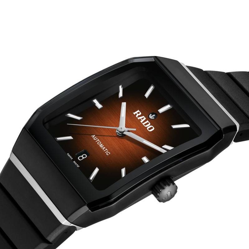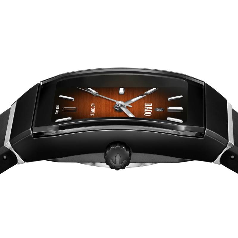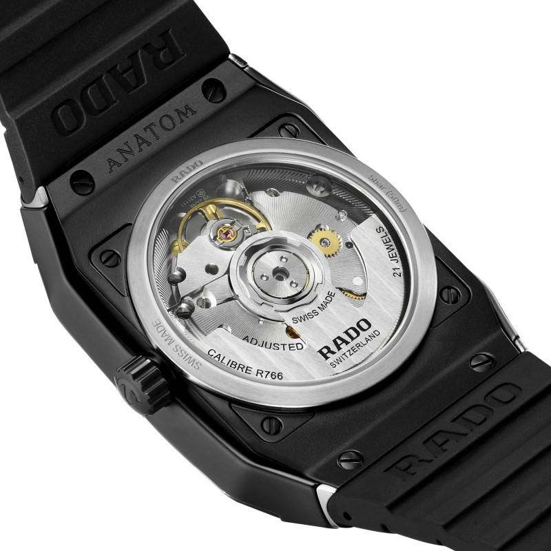 Rado est une entreprise horlogère suisse de renommée mondiale, pionnière en matière d'innovations. Sa philosophie est basée sur la science, la technologie et la recherche sur tous les plans, y compris les matériaux, les mouvements, les designs et les formes. Pour célébrer les 40 ans de la collection Anatom, la marque réédite son modèle en lançant la montre Anatom Automatic R10202309, synonyme d'un design unique et intemporel. Elle est nommée Anatom en raison de l'ajustement parfaitement anatomique de celle-ci au poignet. Ce modèle est livré avec un boîtier rectangulaire très original dont la forme ergonomique est en étroite harmonie avec le poignet. Il est conçu en acier inoxydable PVD noir et mesure 32,50 mm de largeur et 11,30 mm d'épaisseur pour un poids de 90,60 grammes. Composée de céramique haute technologie noire mate, il est muni d'une lunette qui entoure un verre saphir incurvé. Traité en antireflet, ce dernier offre une lisibilité optimale du cadran tout en le protégeant des rayures. À 3 heures, se place la couronne, également, fabriquée en céramique high tech noire mate avec l'ancre Rado gravée en surface. Son crantage bien soigné offre une prise en main facile lors du réglage des aiguilles et de la date. Quant au fond de boîte, il offre une vue fascinante des décorations du mouvement à travers une fenêtre en verre saphir, entourée par un anneau argenté et brossé. Ainsi, vous pourrez admirer agréablement les côtes de Genève sur la masse oscillante, le brossage radial sur le couvercle du barillet et la finition colimaçonnée sur la platine et le pont. À noter que ce fond, traité de PVD noir, est maintenu par des vis et promet une étanchéité de 5 ATM.