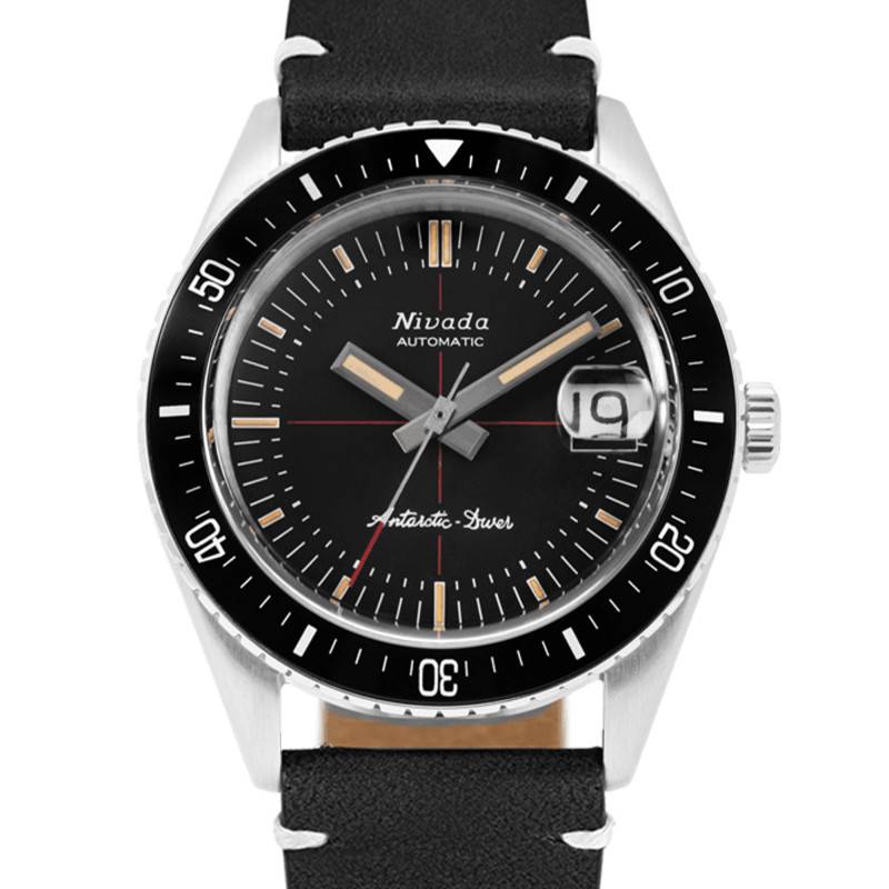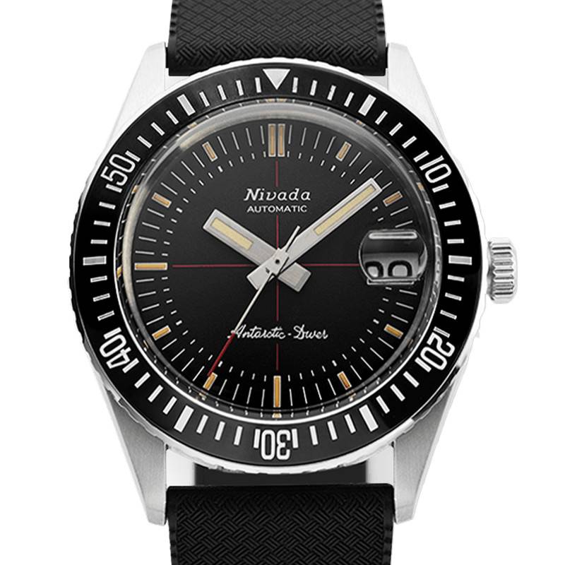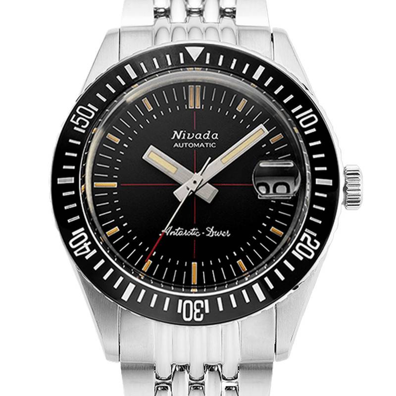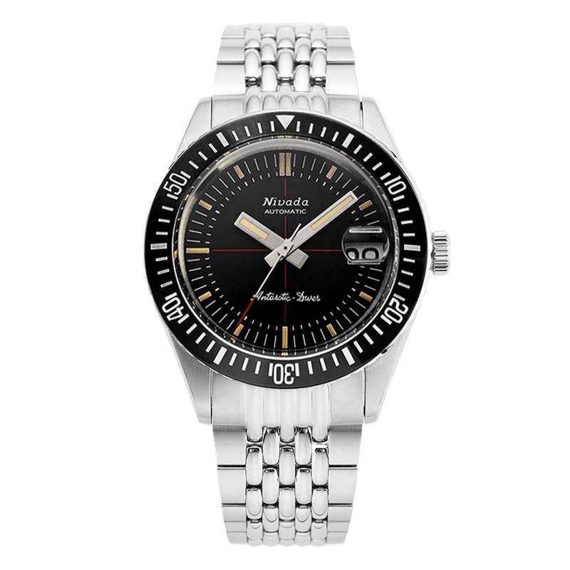 Fondée en 1926, la marque Nivada Grenchen fait parler d'elle grâce à ses fabuleuses montres. Elle confectionne des garde-temps hautement sophistiqués qui sont équipés afin de vous accompagner lors de vos plus grandes aventures. Alliant son savoir-faire et sa créativité, la marque suisse ne cesse d'innover en matière de technologie et design afin de vous parer avec élégance et sérénité. Découvrez la montre Antarctic Diver Ceramic Bezel 32038. Destinée à la gent masculine, elle dévoile un boîtier rond qui est fabriqué en acier inoxydable 316L brossé pour un rendu saisissant au poignet. Parfaitement résistant, ce dernier affiche 38 mm de diamètre et dispose d'une épaisseur de 12,90 mm. Il est orné d'une lunette crantée bidirectionnelle en acier dotée d'un insert en céramique noir qui est marqué par un chemin de fer avec des marqueurs luminescents traités au super luminova C1. Cette dernière entoure un verre saphir double dôme qui protège le cadran des chocs. Il a pour particularité de disposer d'un traitement antireflet qui vous accordera une lecture fluide du temps sous tous les angles. La couronne crantée grise située sur la droite vous aidera lors de la manipulation des différents éléments centraux. Enfin, ce modèle se ferme par un fond vissé qui lui assure une étanchéité de 20 ATM. Ce dernier présente la gravure d'un pingouin et la signature de la marque.