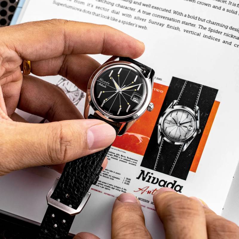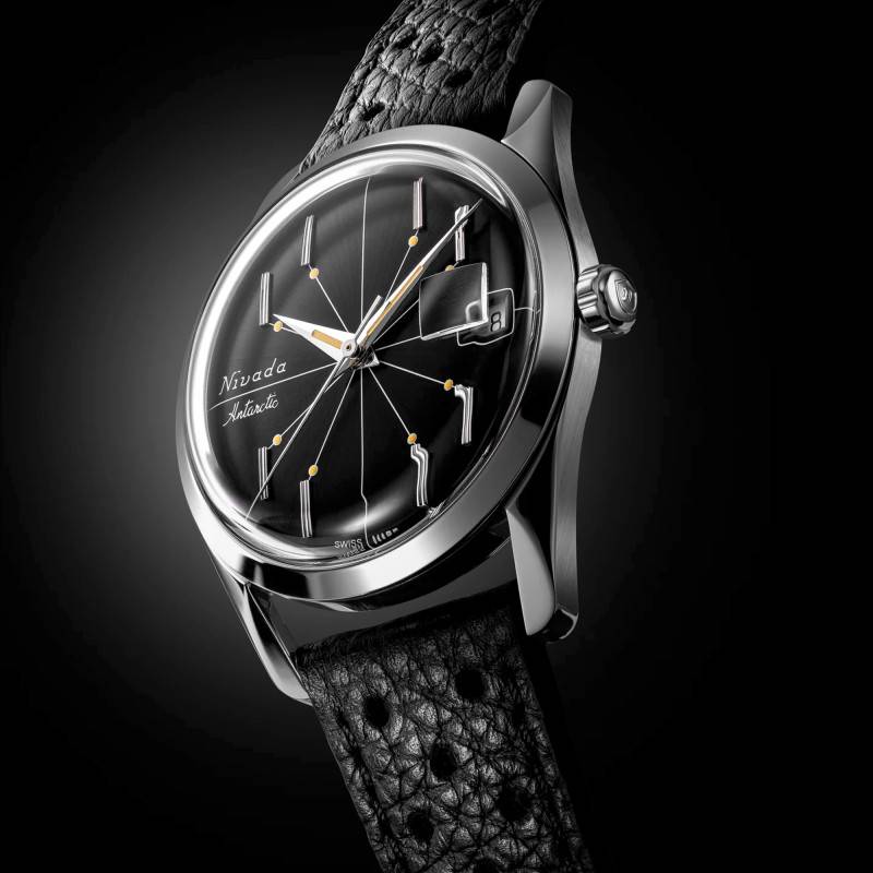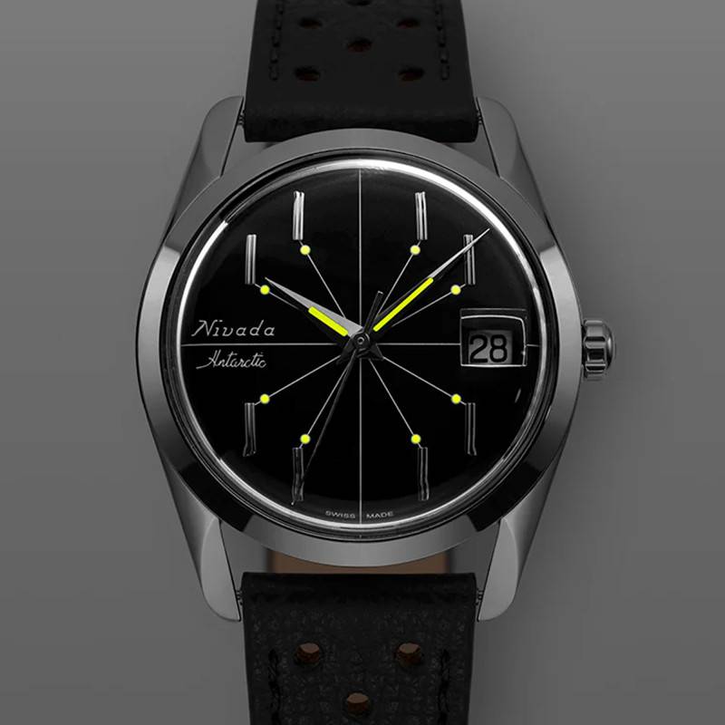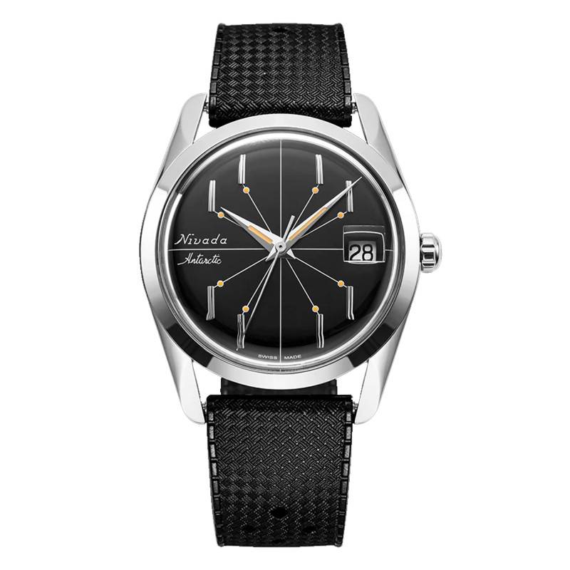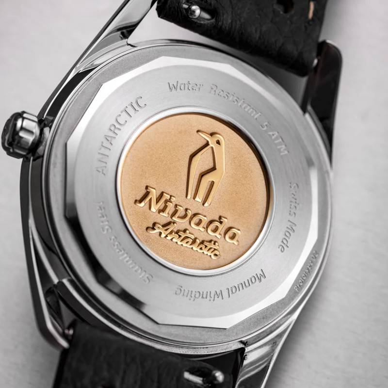 Nivada Grenchen est une marque horlogère suisse connue principalement pour ses montres précises et ses designs innovants et intemporels. Elle confectionne des montres mécaniques de haute précision et de qualité suisse qui sont destinées à vous accompagner dans vos plus belles aventures. Grâce à son savoir-faire et à sa créativité, elle présente des modèles combinant l'artisanat horloger traditionnel avec des mécanismes de pointe modernes donnant vie à des garde-temps fiables. De plus, ils sont réalisés à partir de matériaux robustes assurant ainsi une certaine durabilité. Aujourd'hui, cette maison horlogère vous invite à découvrir la montre Antarctic Spider Black 35mm 35011. Elle est issue d'une variation que la marque a produite dans les années 70. Elle dévoile un boîtier rond réalisé en acier inoxydable 316L qui affiche 35 mm de diamètre et 41,80 mm de longueur pour une épaisseur de 10,10 mm, des dimensions idéales pour tous les genres. Brossé et poli, il est muni d'une couronne grise et crantée qui favorise une bonne prise en main. Cette dernière est vissée à 3 heures et a pour rôle de manipuler les différents éléments centraux. Un verre saphir double dôme surmonte son cadran et le protège des chocs éventuels. Enfin, ce modèle se ferme par un fond vissé assurant une étanchéité de 5 ATM. Il est gravé de quelques informations avec un médaillon doré dévoilant en relief un Pingouin et le nom de la marque.