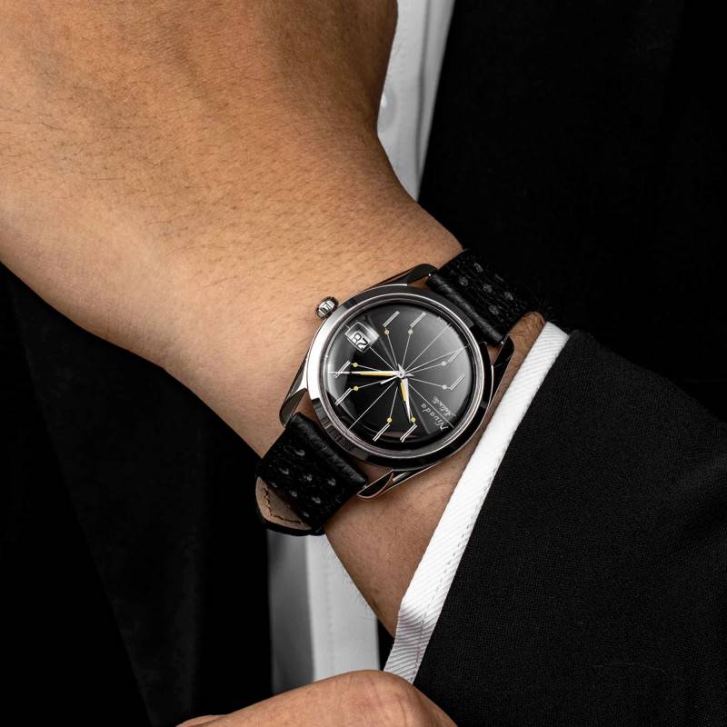 Ce cadran à la fois original et audacieux est inspiré des années 1950 et apporte un style captivant à ce garde-temps. Il est parfaitement disposé à vous accorder une lecture temporelle fiable au quotidien. Il prend une forme ronde et arbore un fond noir sur lequel sont tracés des lignes en forme de toile partant du centre jusqu'aux index appliqués illustrant des pattes d'araignée démarquant les heures. Sur cette même intersection, trois aiguilles argentées sont placées. La fine trotteuse totalise les secondes, la grande aiguille désigne les minutes et la courte les heures. Ces deux dernières sont de type dauphine et sont revêtues d'un traitement super-luminova 148C favorisant une meilleure lisibilité en cas de faible luminosité. Ce même revêtement se retrouve également sur les indices en forme de points. Un guichet date recouvert d'un verre cyclope les rejoints à 3 heures pour plus de fonctionnalités tandis qu'à l'opposé, le nom de la marque et celui de la collection sont mentionnés. Enfin, à 6 heures, est marqué le label Swiss made, symbole d'authenticité et de fiabilité en guise de signature.