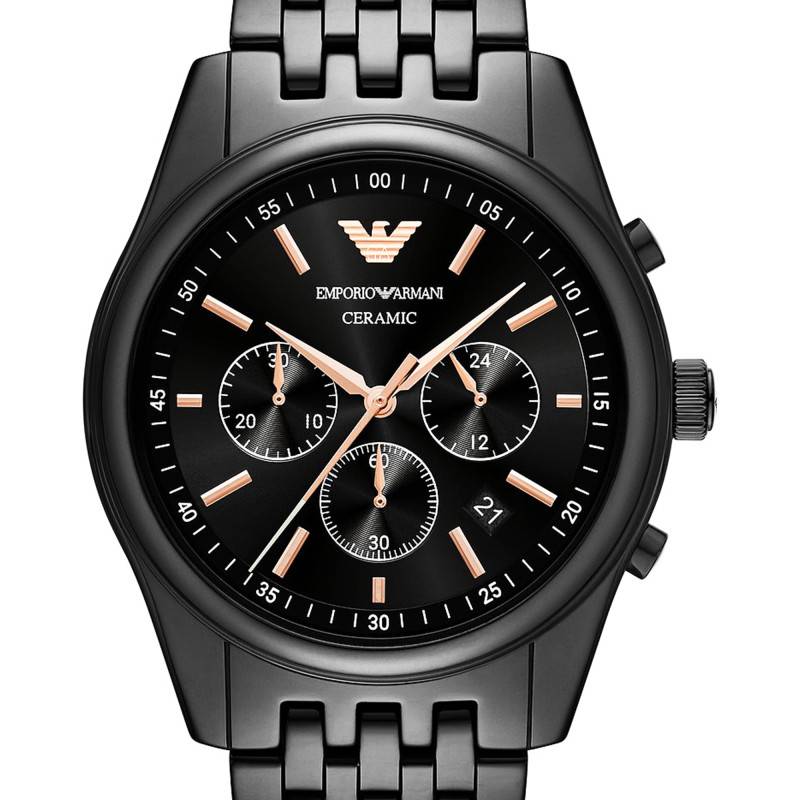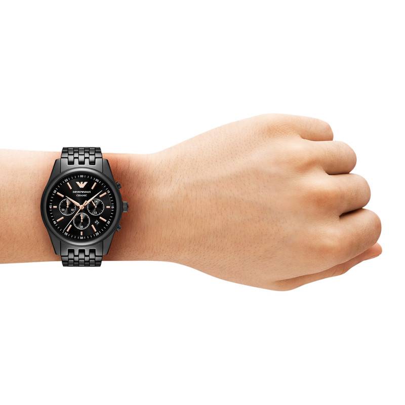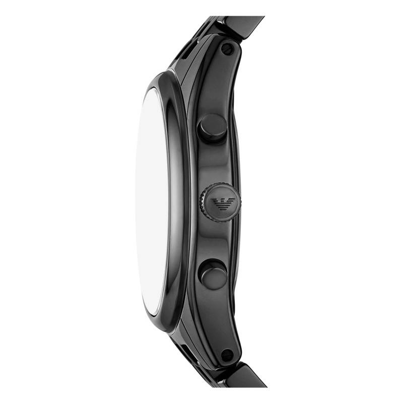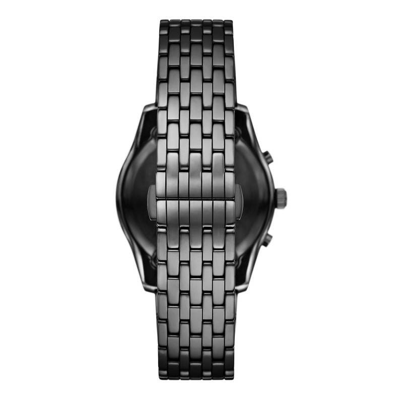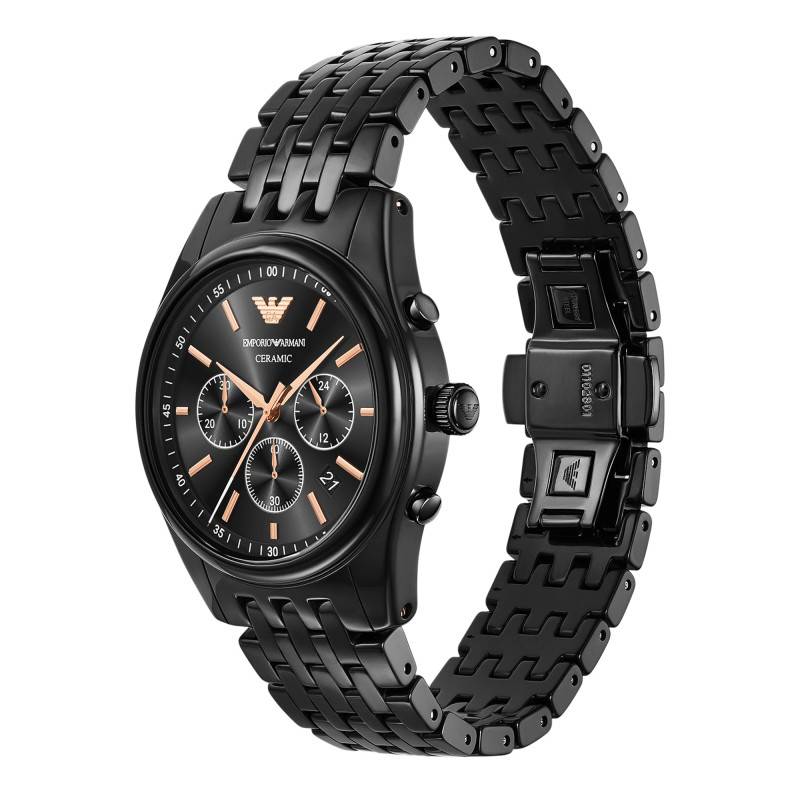 La montre Emporio Armani AR70015 incarne l'élégance et la sophistication avec son boîtier rond en céramique noire. D'un diamètre de 43 mm et d'une épaisseur de 11,70 mm, elle présente une construction robuste tout en étant incroyablement légère grâce à l'utilisation de la céramique, reconnue pour sa durabilité et sa résistance aux rayures. Le boîtier bénéficie d'une finition polie et brillante. La montre est dotée d'un fond emboîté, assurant une protection efficace du mécanisme interne tout en renforçant l'esthétique épurée. La couronne remontoir et les deux boutons poussoirs, essentiels pour la fonction chronographe, sont intégrés de manière subtile au design, ajoutant un clin d'œil fonctionnel au style global.