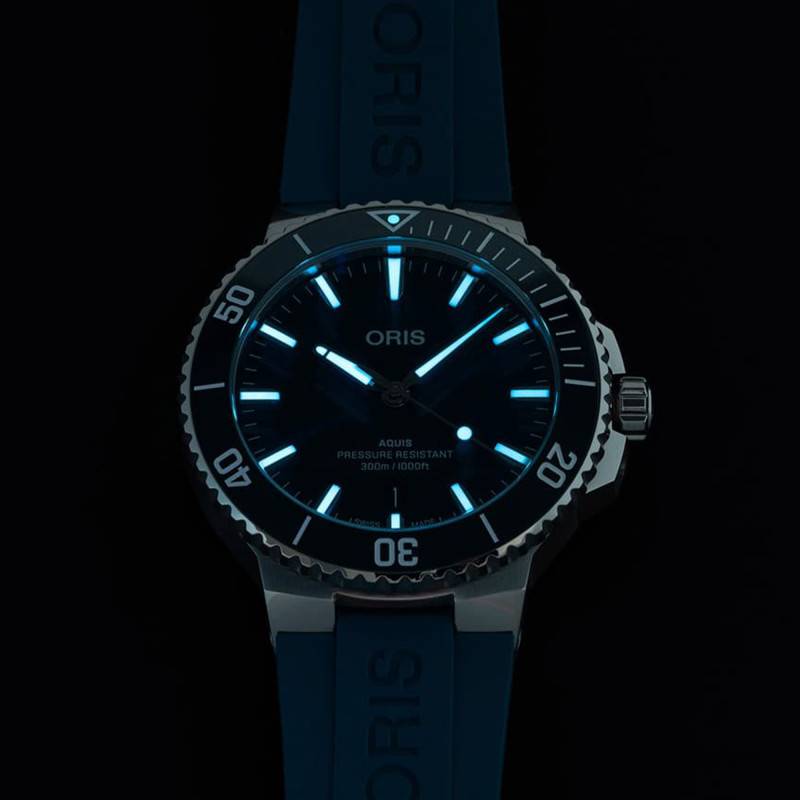 Le cadran de cette montre est un mélange d'élégance intemporelle et d'esthétique contemporaine. Il se caractérise par un design épuré, permettant une lecture aisée et claire du temps. Sa base bleue est magnifiée par une finition soleillée reflétant des rayons qui illuminent à chaque regard. Ce fond présente sur sa bordure des index de type bâtons remplis d'un traitement Super Luminova® qui garantit une excellente lisibilité dans des conditions à faible luminosité. Cette luminescence couvre également les surfaces des aiguilles volumineuses des heures et des minutes ainsi que le disque de la trotteuse Lollipop qui, par leur mouvement, vous communiqueront les heures, les minutes et les secondes. Pour plus de précisions sur le temps, un chemin de fer des minutes prend place sur le pourtour. Un guichet date, placé à 6 heures, vient compléter ce design soigné et très réussi en offrant un équilibre apprécié. Le texte de la marque, lui aussi, contribue à la beauté de la montre avec le nom « Oris » à 12 heures alors que sur le côté opposé, sont inscrites les mentions « Aquis », « Pressure Resistant » et « 300 Bar/300 M ».