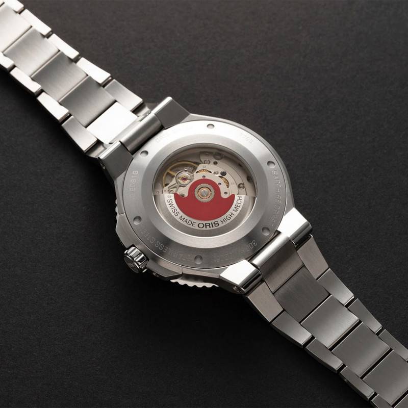 Conçu par les horlogers d'Oris sur la base de Sellita SW200-1, c'est un mouvement automatique hautement précis qui donnera vie à cette montre. Il s'agit plus précisément du calibre maison 733. Comme tous les mécanismes de la marque, ce dernier se montrera performant et efficace en toute occasion. Offrant une réserve de marche de 38 heures, il assurera la fluidité et la bonne marche des aiguilles et du guichet, vous permettant d'effectuer une lecture fiable et exacte des heures, des minutes, des secondes et de la date. Ce mécanisme à 26 rubis fonctionne à une fréquence de 28.800 vibrations/heure (4 Hz) et est doté du dispositif stop seconde.